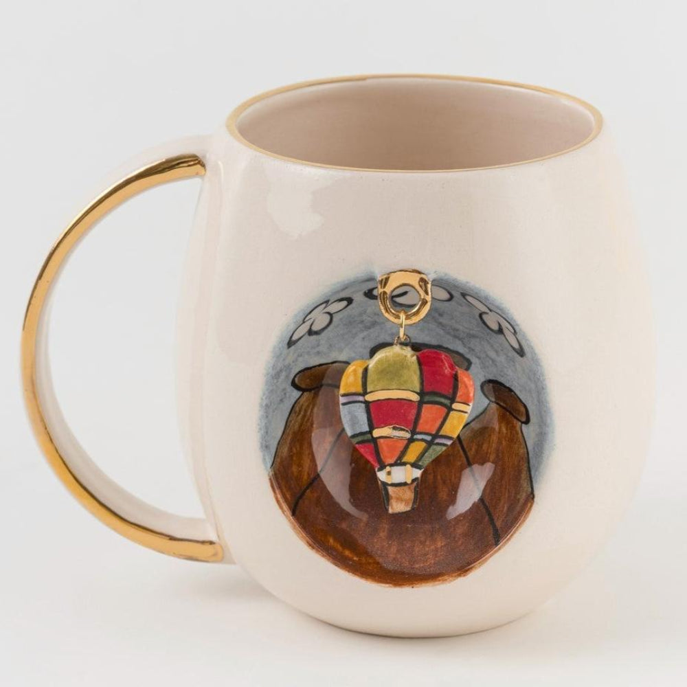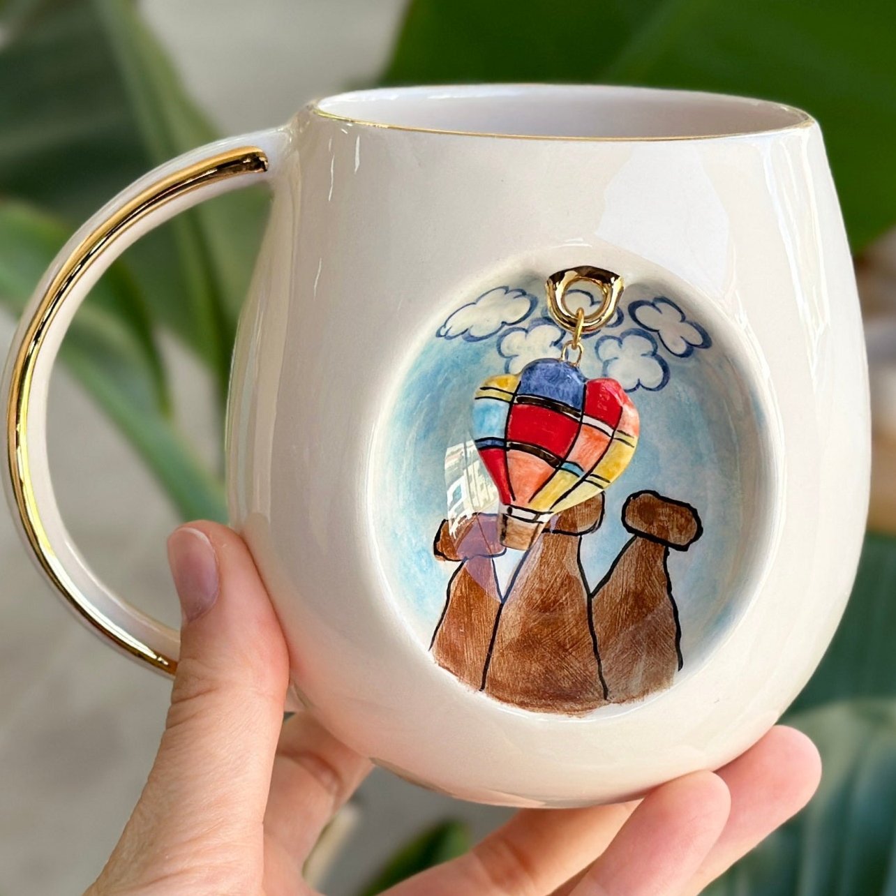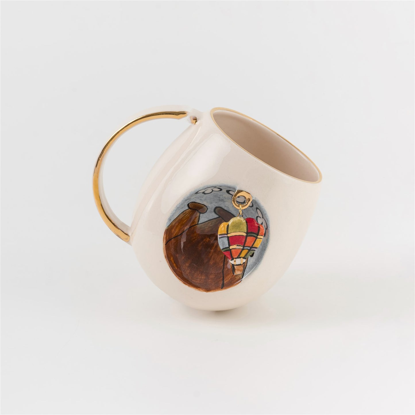 Bu ürün, kupa üzerindeki oyukta Kapadokya deseni ve sabit halkaya takılı seramik balon figürü içerir. Halka, üretim aşamasında fincanla beraber üretildiği için çıkma söz konusu değildir.