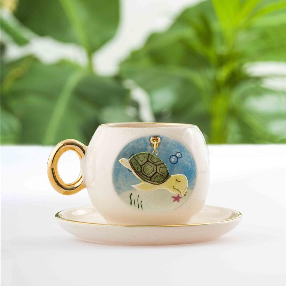 Bu ürün fincan üzerindeki oyukta sabit halkaya takılı seramik Caretta figürü içerir. Halka, üretim aşamasında fincanla beraber üretildiği için çıkma söz konusu değildir.