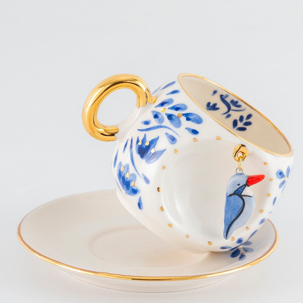 Fincanın ön yüzünde yer alan kuş figürü sadece şıklık katmakla kalmaz, aynı zamanda ürünü kişiselleştirilebilir bir hediye haline getirir. Yine altın kaplama detaylar, kulp kısmında, ağız kenarında ve tabağın çerçevesinde zarif bir dokunuşla tamamlanmıştır. Dilerseniz tabağa özel isim yazdırarak fincanı daha da anlamlı hâle getirebilirsiniz.