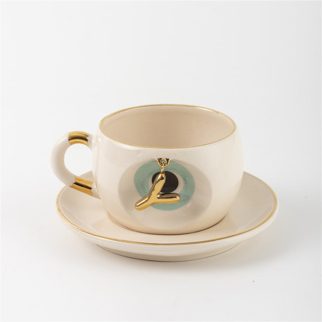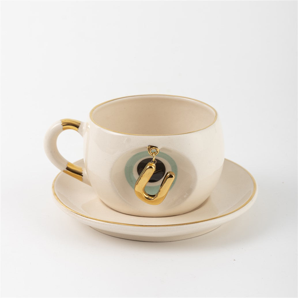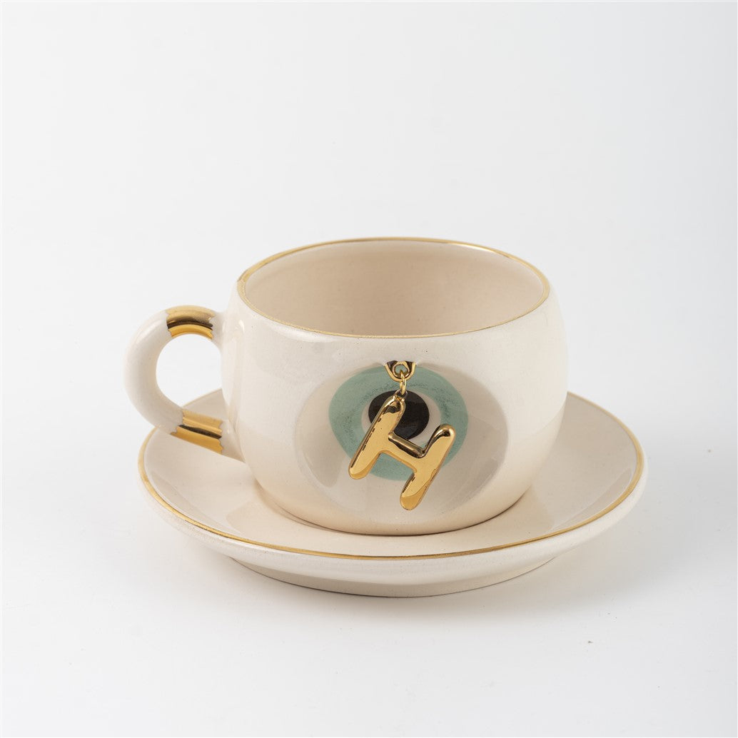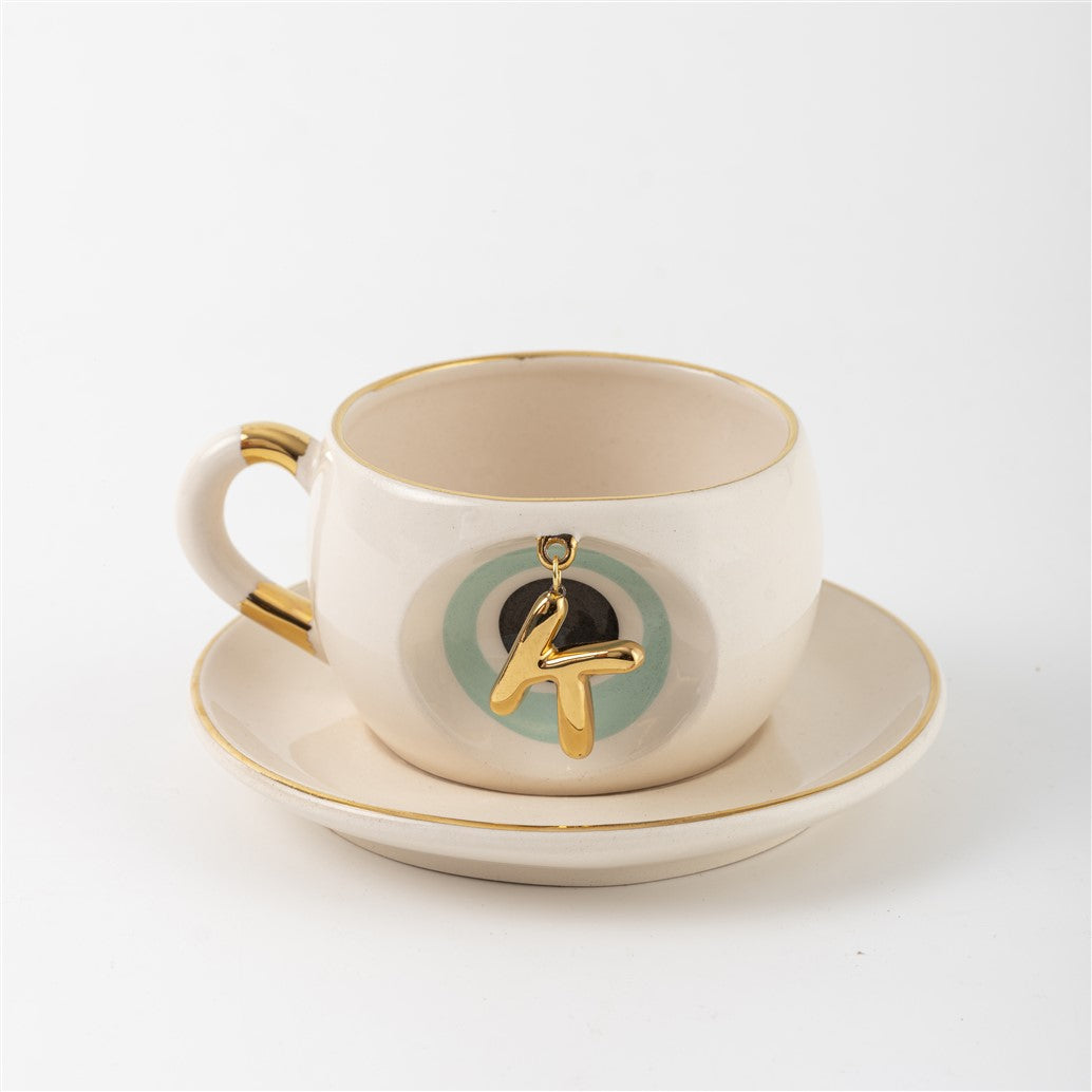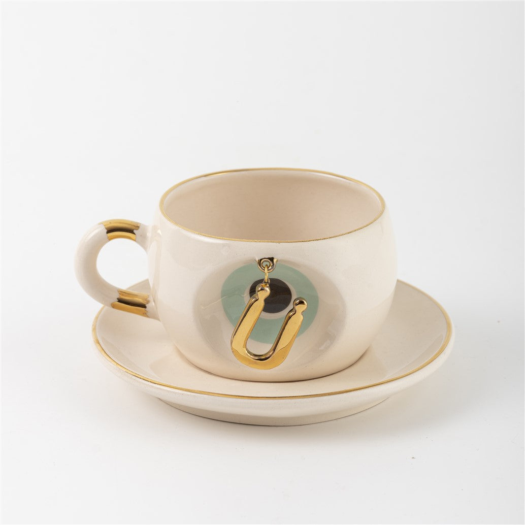 Ön yüzdeki oyukta, üretim aşamasında gövdeyle birlikte oluşturulan sabit halkaya takılı seramik üzeri altın kaplama harf yer alır; bu sağlam yapı sayesinde çıkma söz konusu değildir. Kulp, ağız kenarı ve tabak çevresindeki 24 ayar altın çizgiler fincana sofistike bir ışıltı katar. Anlamlı ve şık bir nazar boncuklu fincan arayanlar için hem günlük kullanımda hem de hediye tercihlerinde fark yaratan bir seçenektir.