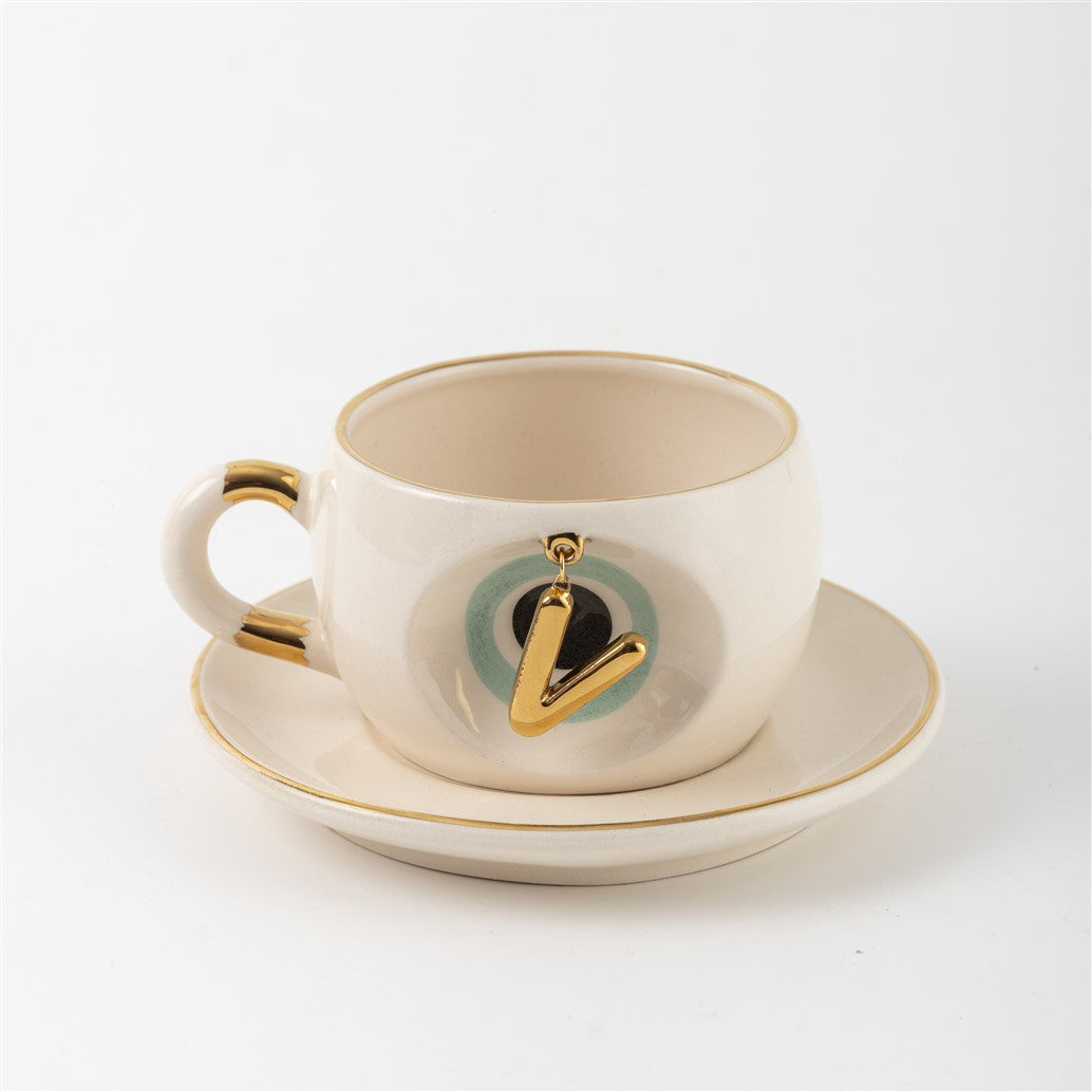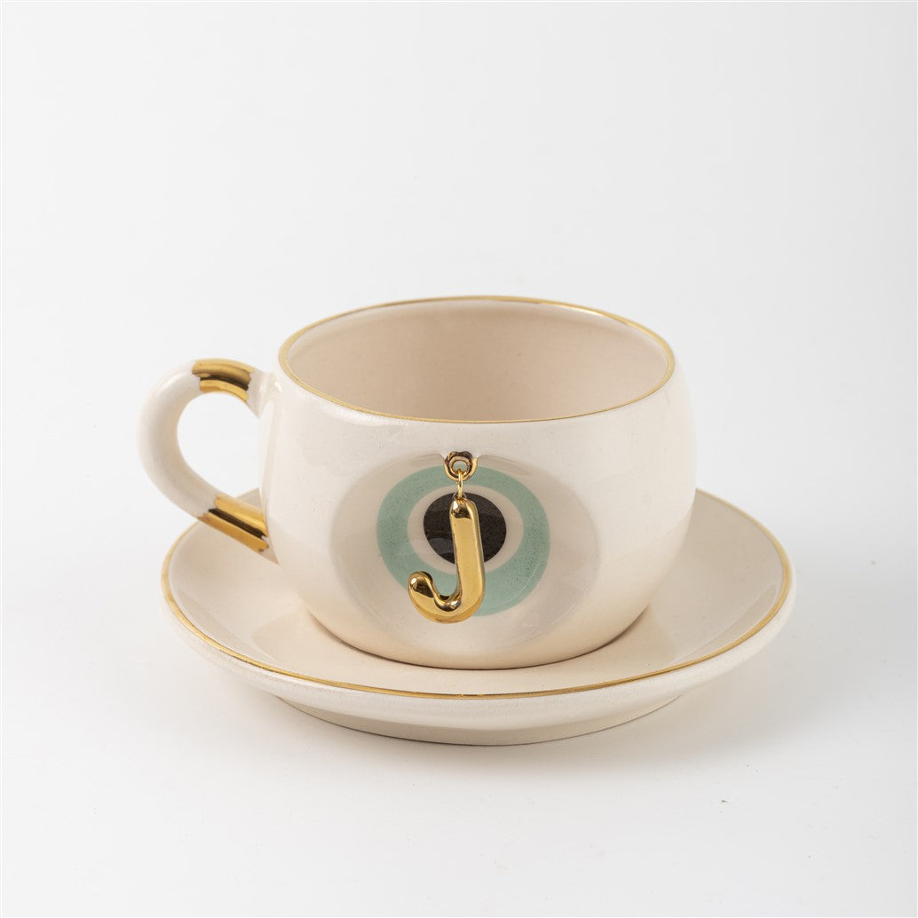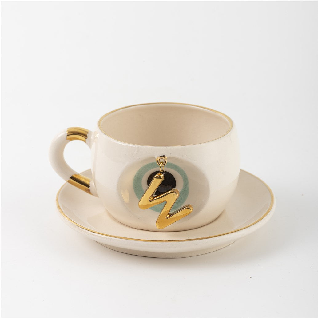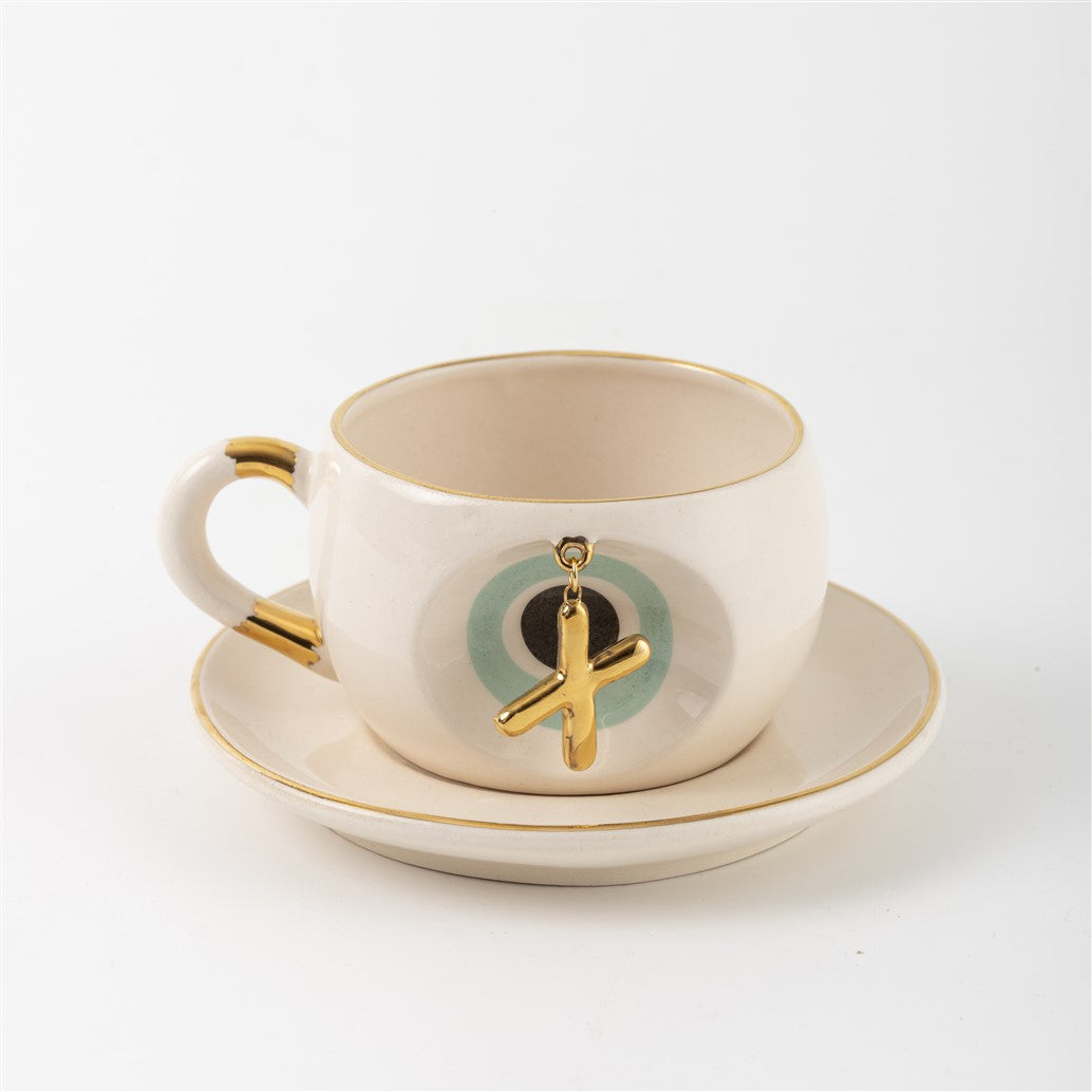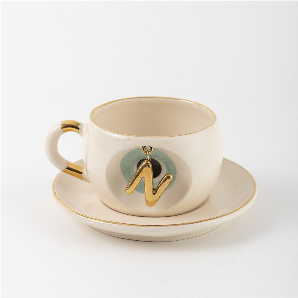 Ön yüzdeki oyukta, üretim aşamasında gövdeyle birlikte oluşturulan sabit halkaya takılı seramik üzeri altın kaplama harf yer alır; bu sağlam yapı sayesinde çıkma söz konusu değildir. Kulp, ağız kenarı ve tabak çevresindeki 24 ayar altın çizgiler fincana sofistike bir ışıltı katar. Anlamlı ve şık bir nazar boncuklu fincan arayanlar için hem günlük kullanımda hem de hediye tercihlerinde fark yaratan bir seçenektir.