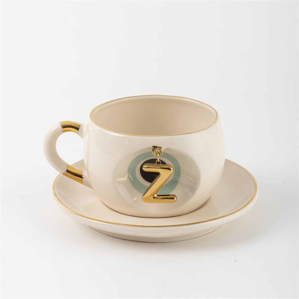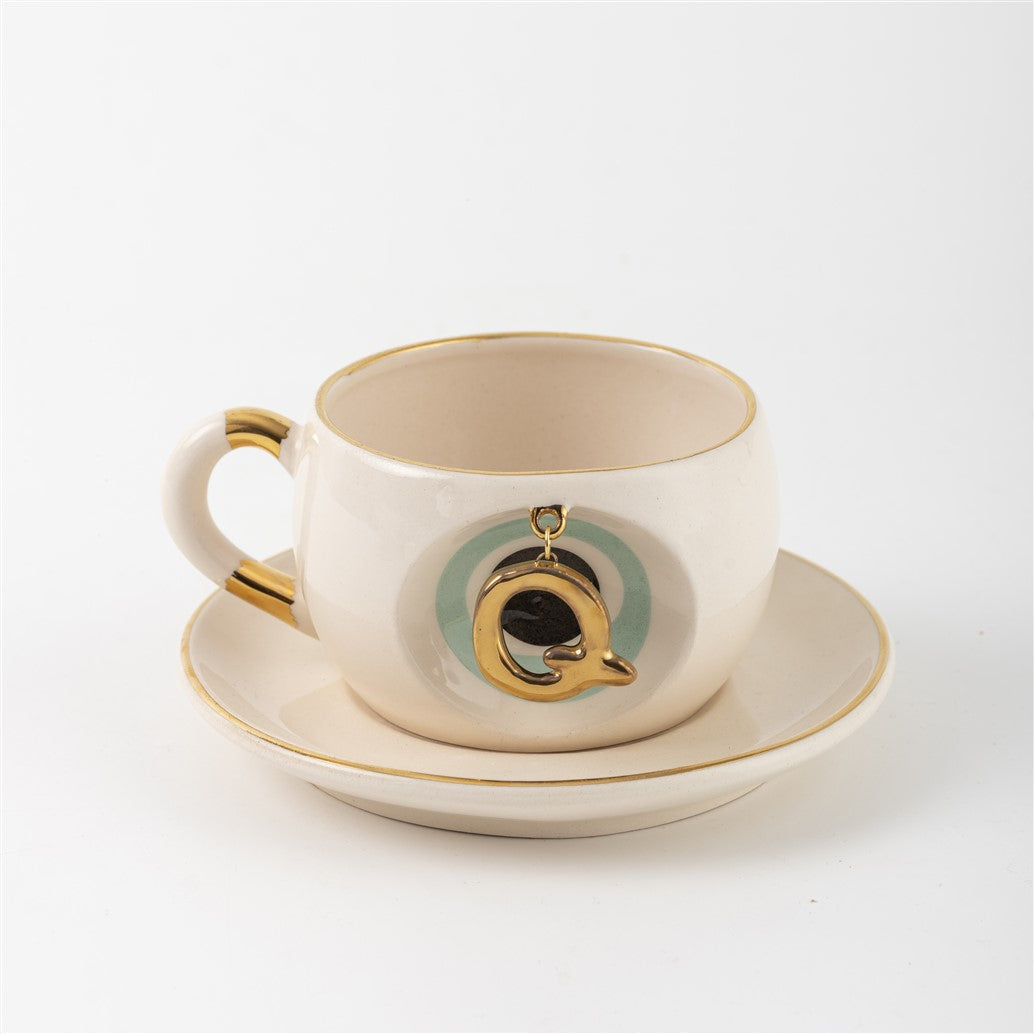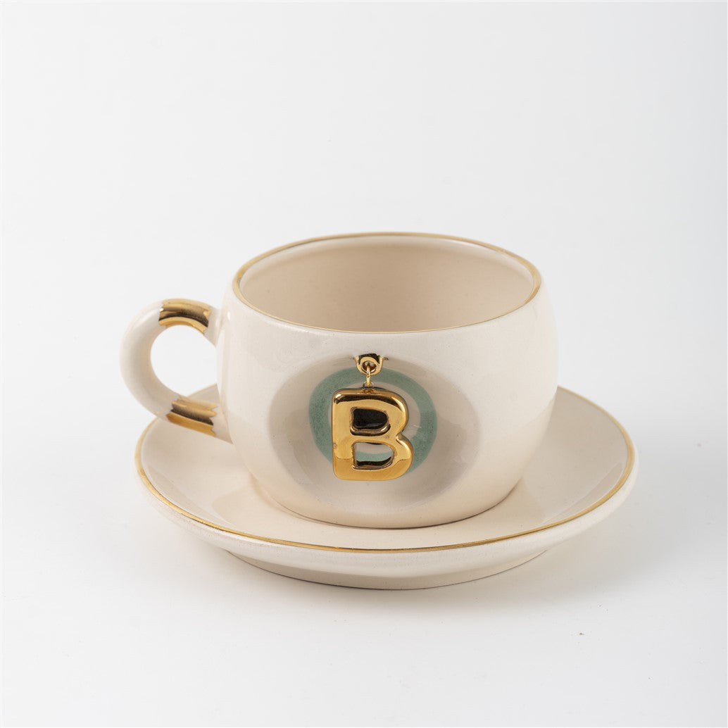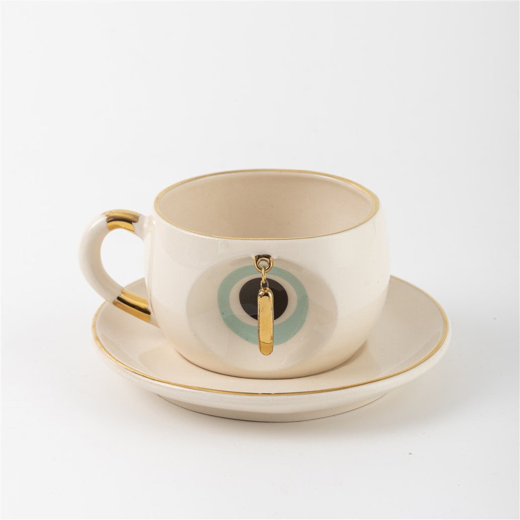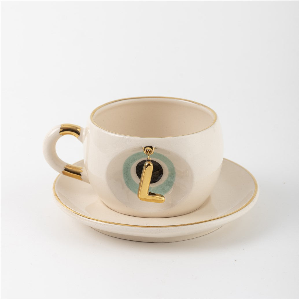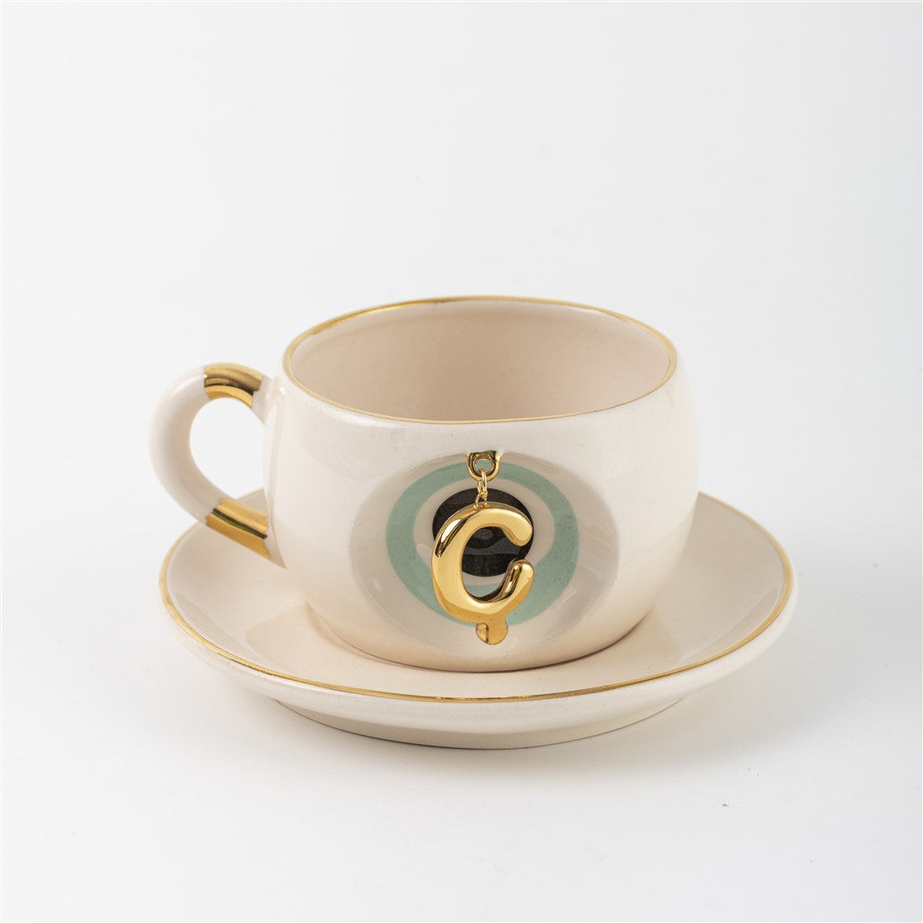 Ön yüzdeki oyukta, üretim aşamasında gövdeyle birlikte oluşturulan sabit halkaya takılı seramik üzeri altın kaplama harf yer alır; bu sağlam yapı sayesinde çıkma söz konusu değildir. Kulp, ağız kenarı ve tabak çevresindeki 24 ayar altın çizgiler fincana sofistike bir ışıltı katar. Anlamlı ve şık bir nazar boncuklu fincan arayanlar için hem günlük kullanımda hem de hediye tercihlerinde fark yaratan bir seçenektir.