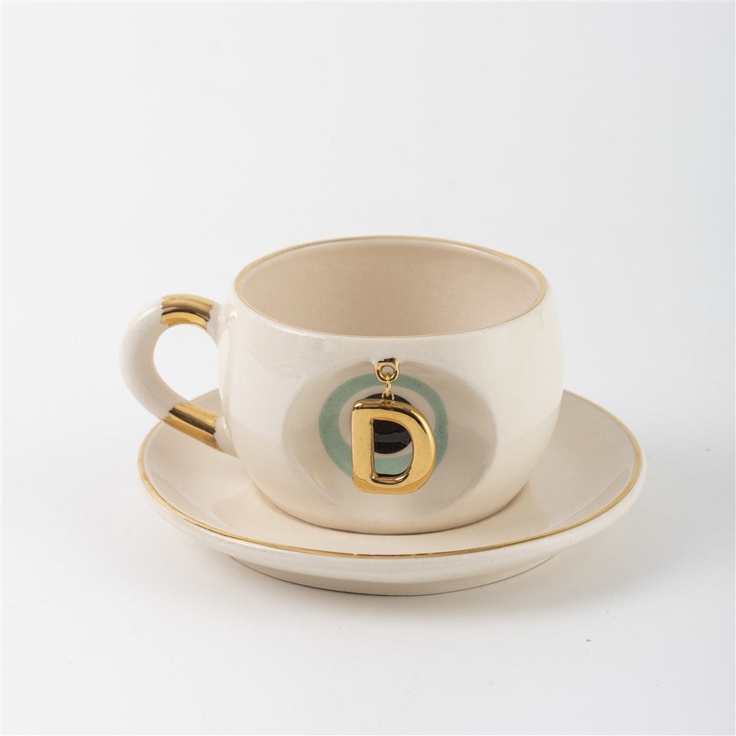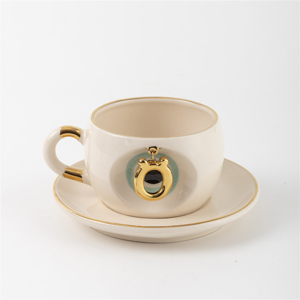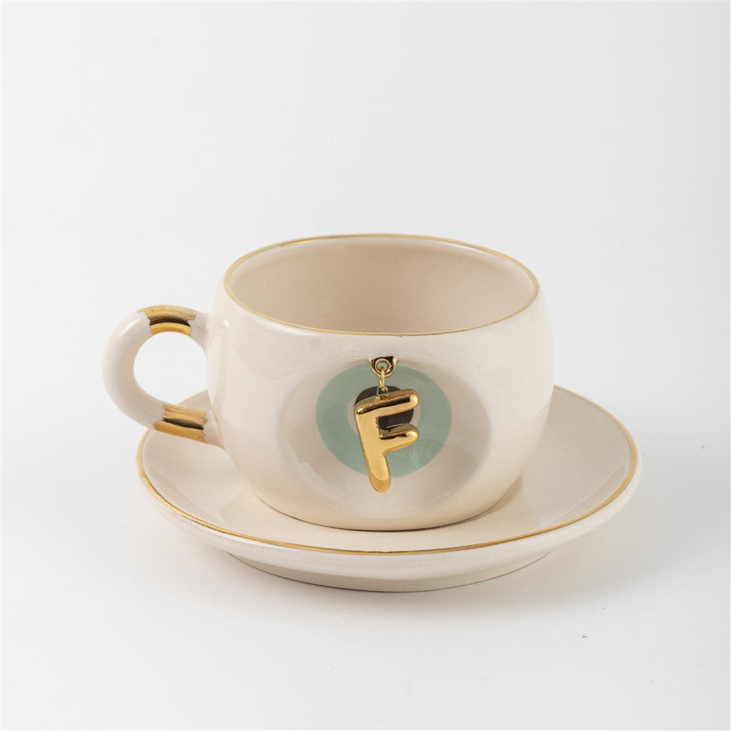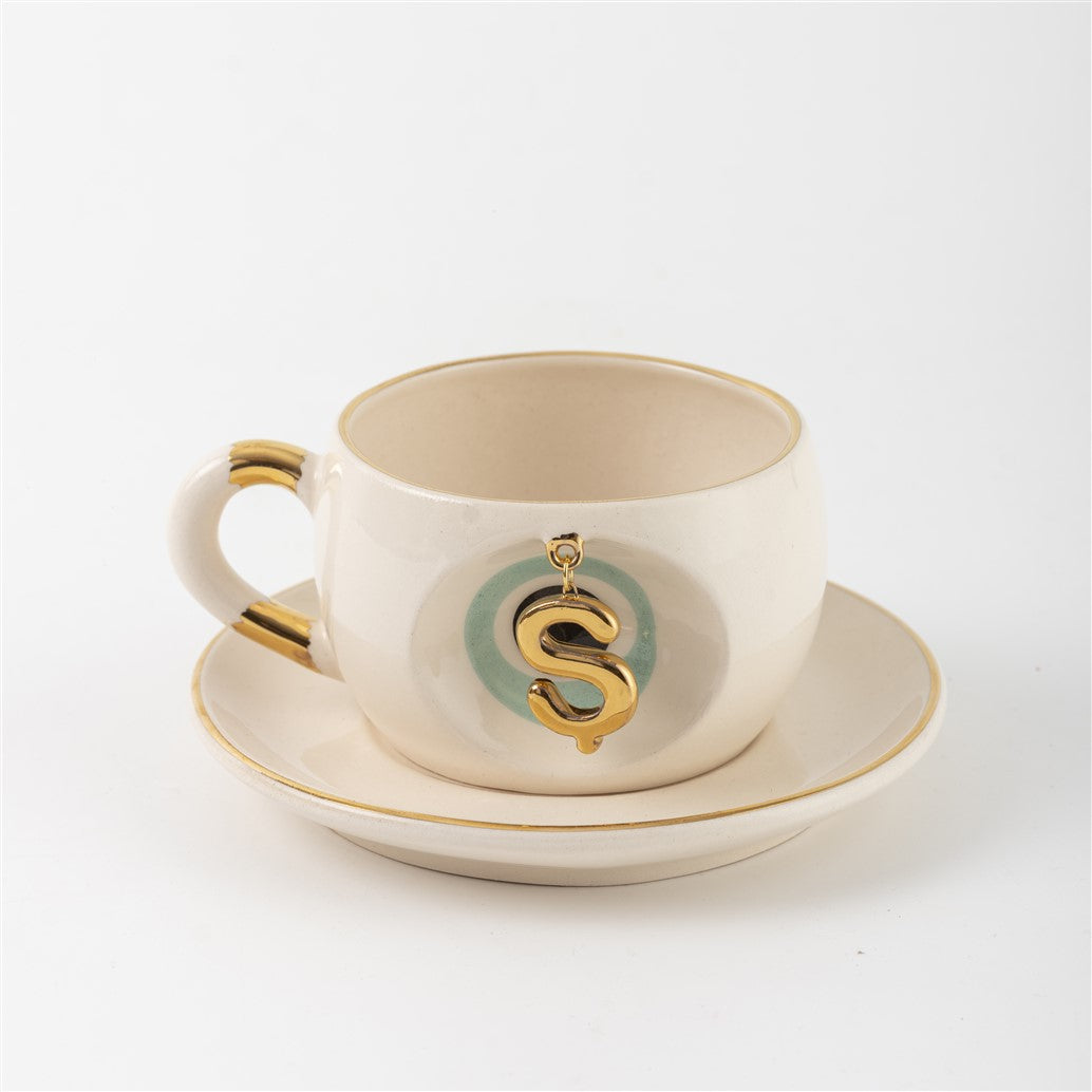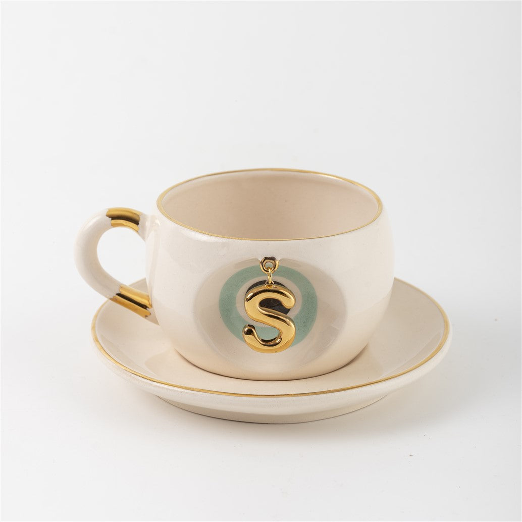 Ön yüzdeki oyukta, üretim aşamasında gövdeyle birlikte oluşturulan sabit halkaya takılı seramik üzeri altın kaplama harf yer alır; bu sağlam yapı sayesinde çıkma söz konusu değildir. Kulp, ağız kenarı ve tabak çevresindeki 24 ayar altın çizgiler fincana sofistike bir ışıltı katar. Anlamlı ve şık bir nazar boncuklu fincan arayanlar için hem günlük kullanımda hem de hediye tercihlerinde fark yaratan bir seçenektir.