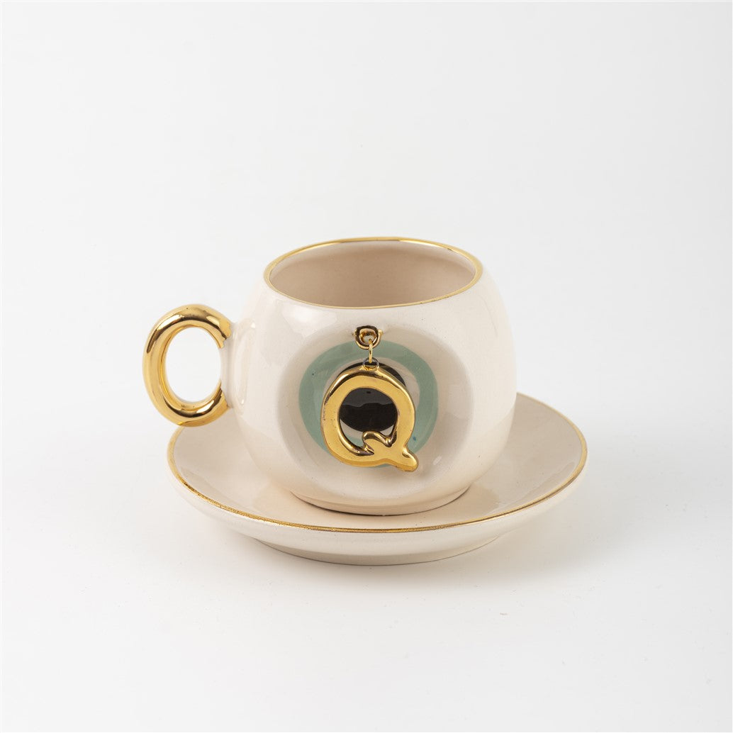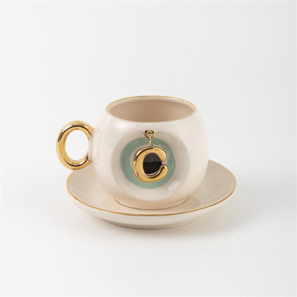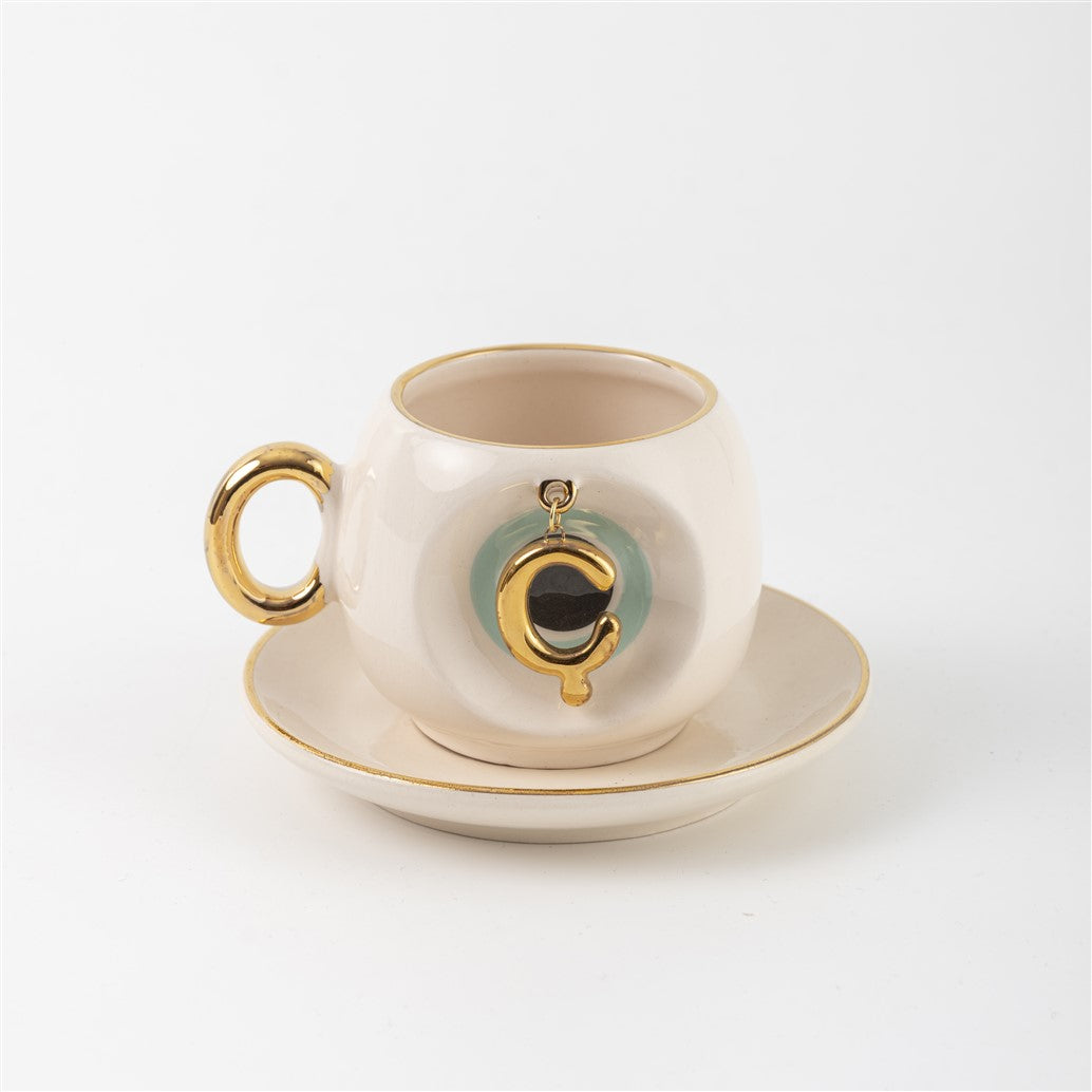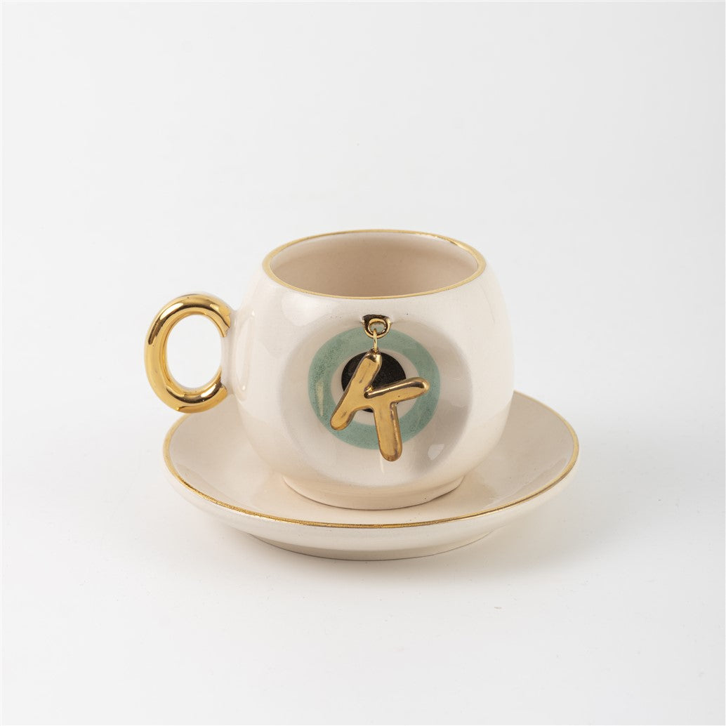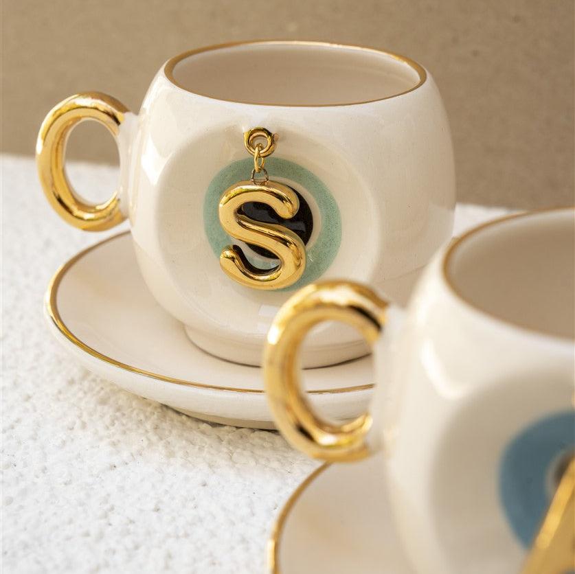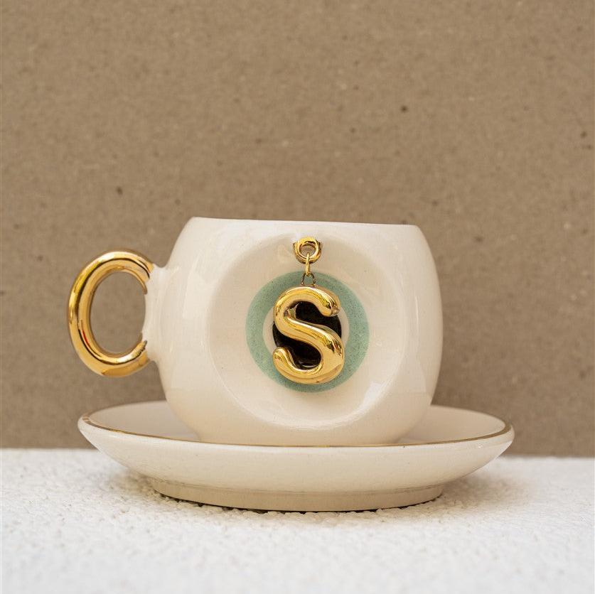 Ön yüzdeki oyukta, üretim sırasında gövdeyle birlikte oluşturulan sabit halkaya takılı seramik üzeri altın kaplama harf bulunur; bu sağlam yapı sayesinde çıkma söz konusu değildir. Kulp, ağız kenarı ve tabak çevresindeki 24 ayar altın çizgiler fincana sofistike bir ışıltı katar.