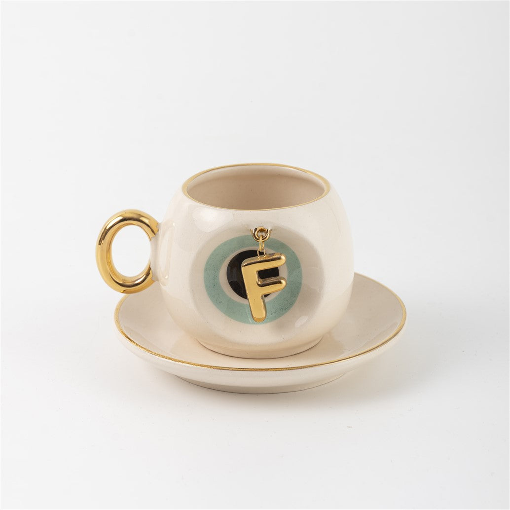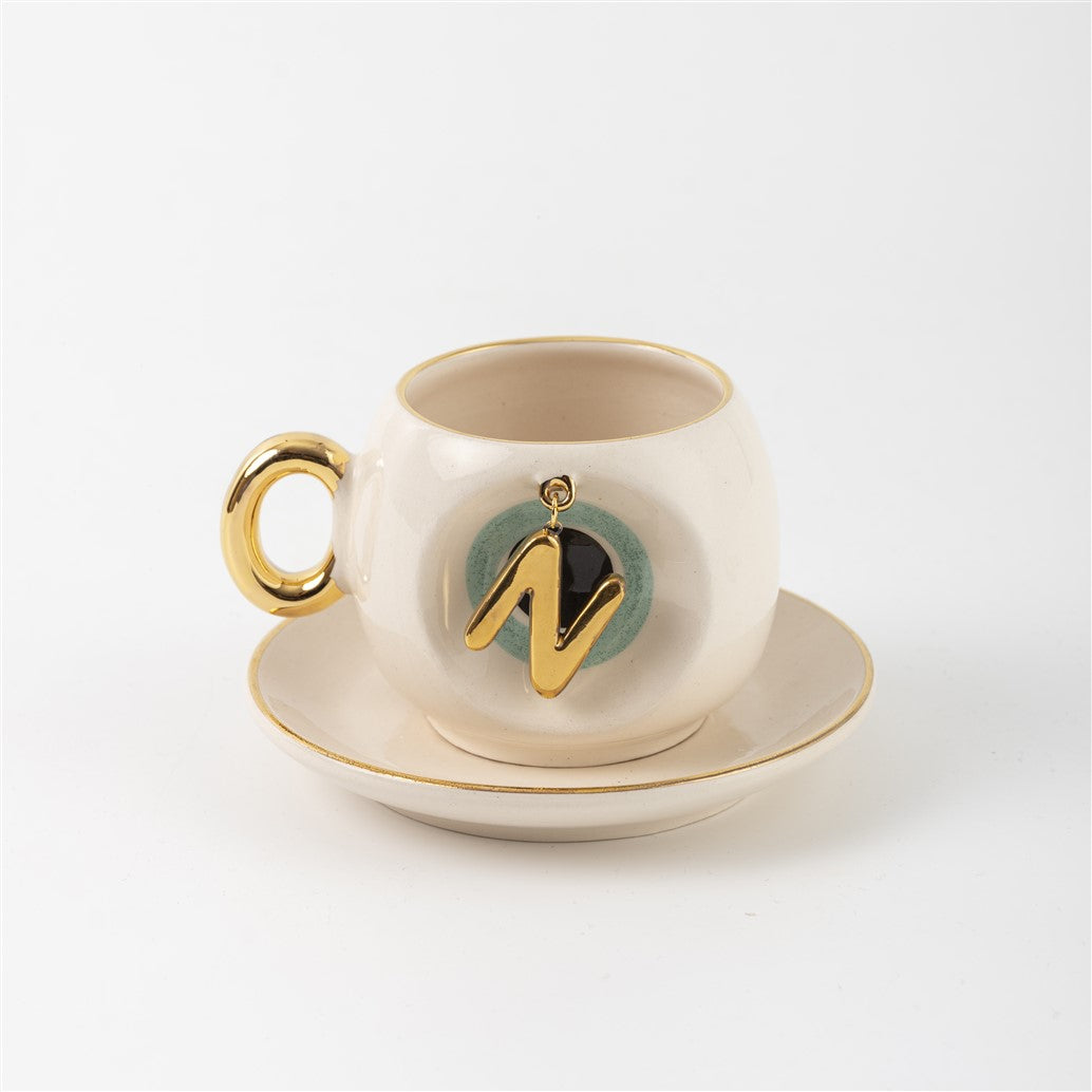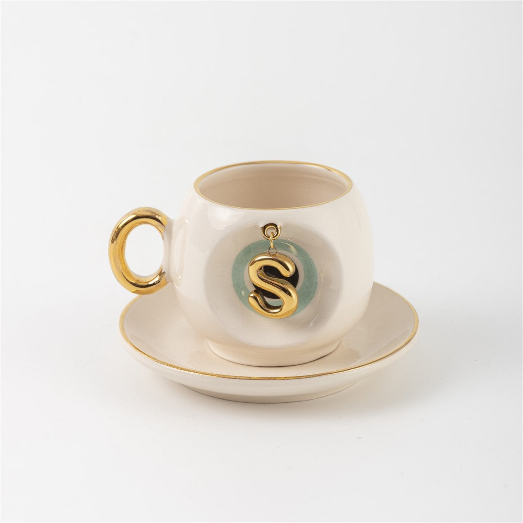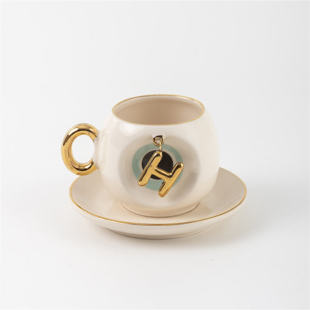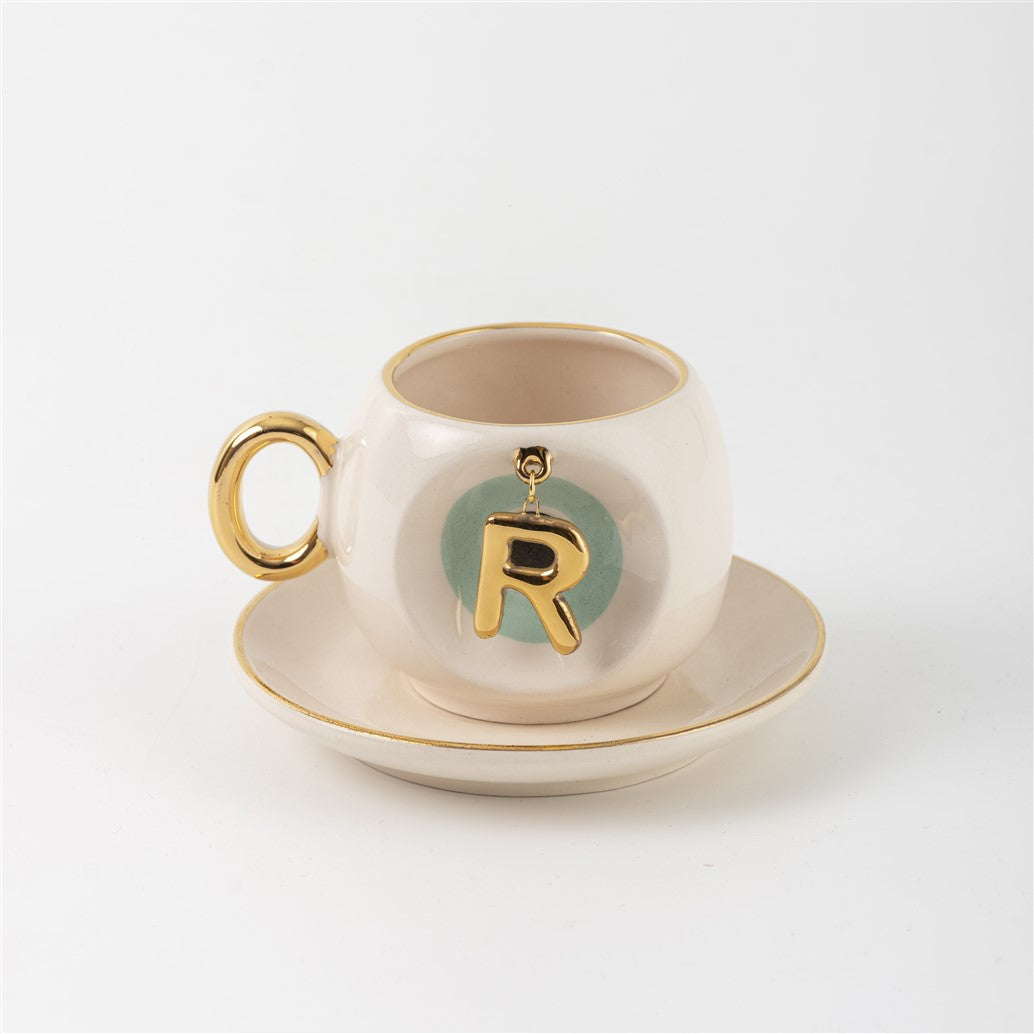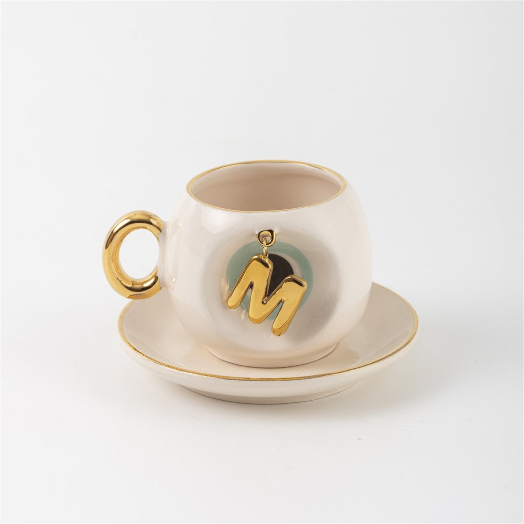 Ön yüzdeki oyukta, üretim sırasında gövdeyle birlikte oluşturulan sabit halkaya takılı seramik üzeri altın kaplama harf bulunur; bu sağlam yapı sayesinde çıkma söz konusu değildir. Kulp, ağız kenarı ve tabak çevresindeki 24 ayar altın çizgiler fincana sofistike bir ışıltı katar.