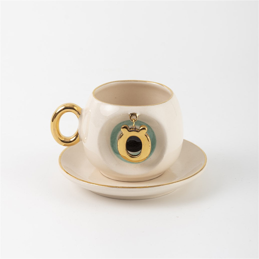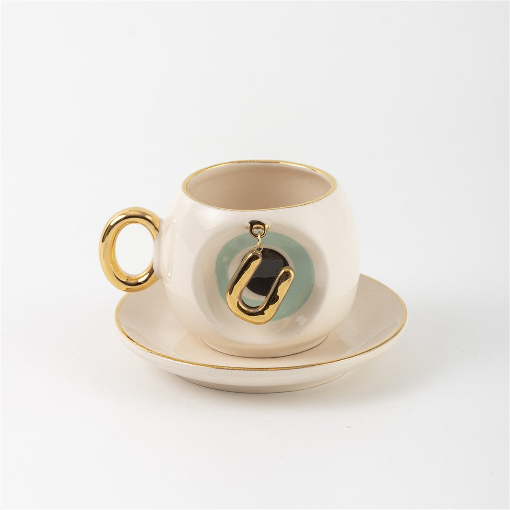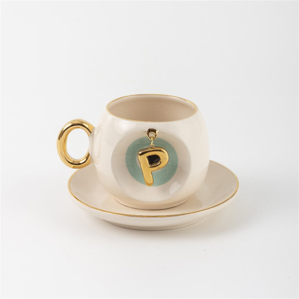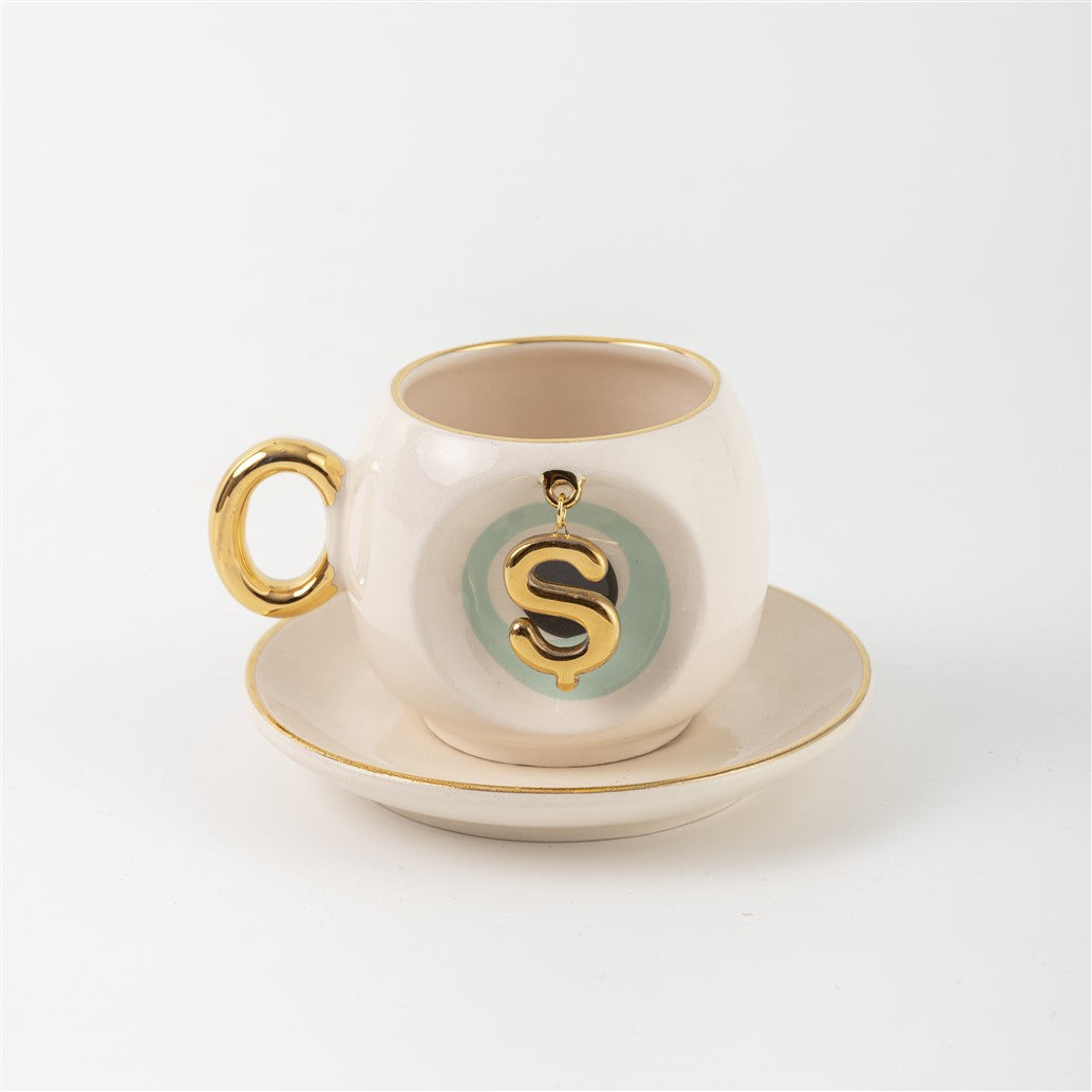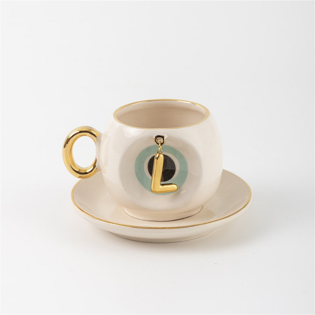 Ön yüzdeki oyukta, üretim sırasında gövdeyle birlikte oluşturulan sabit halkaya takılı seramik üzeri altın kaplama harf bulunur; bu sağlam yapı sayesinde çıkma söz konusu değildir. Kulp, ağız kenarı ve tabak çevresindeki 24 ayar altın çizgiler fincana sofistike bir ışıltı katar.