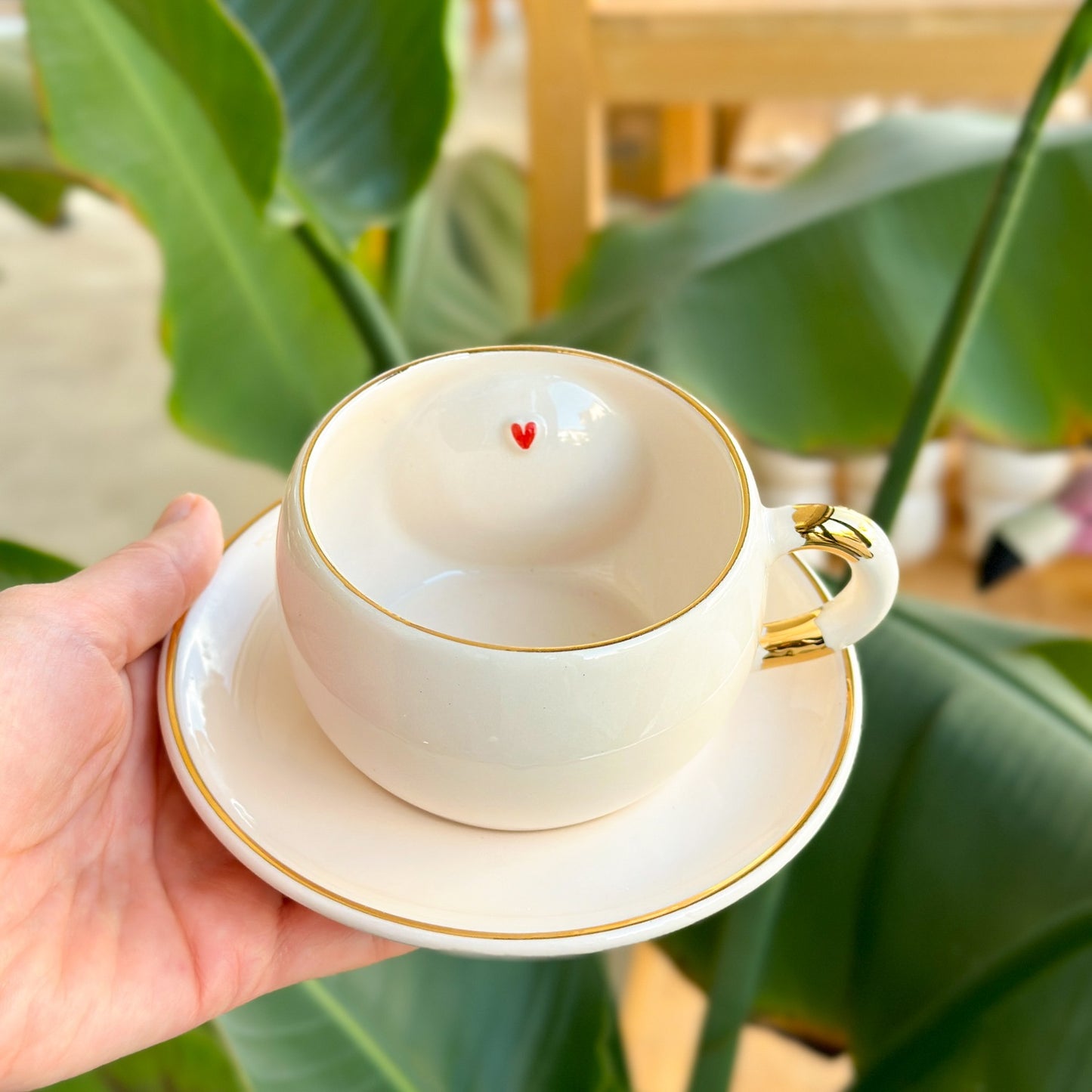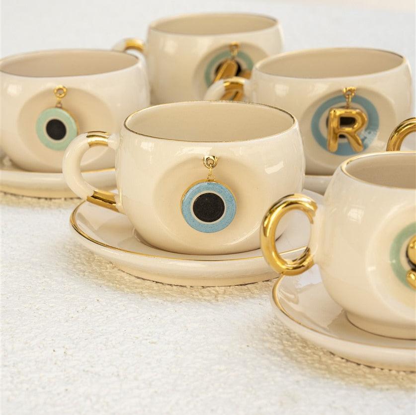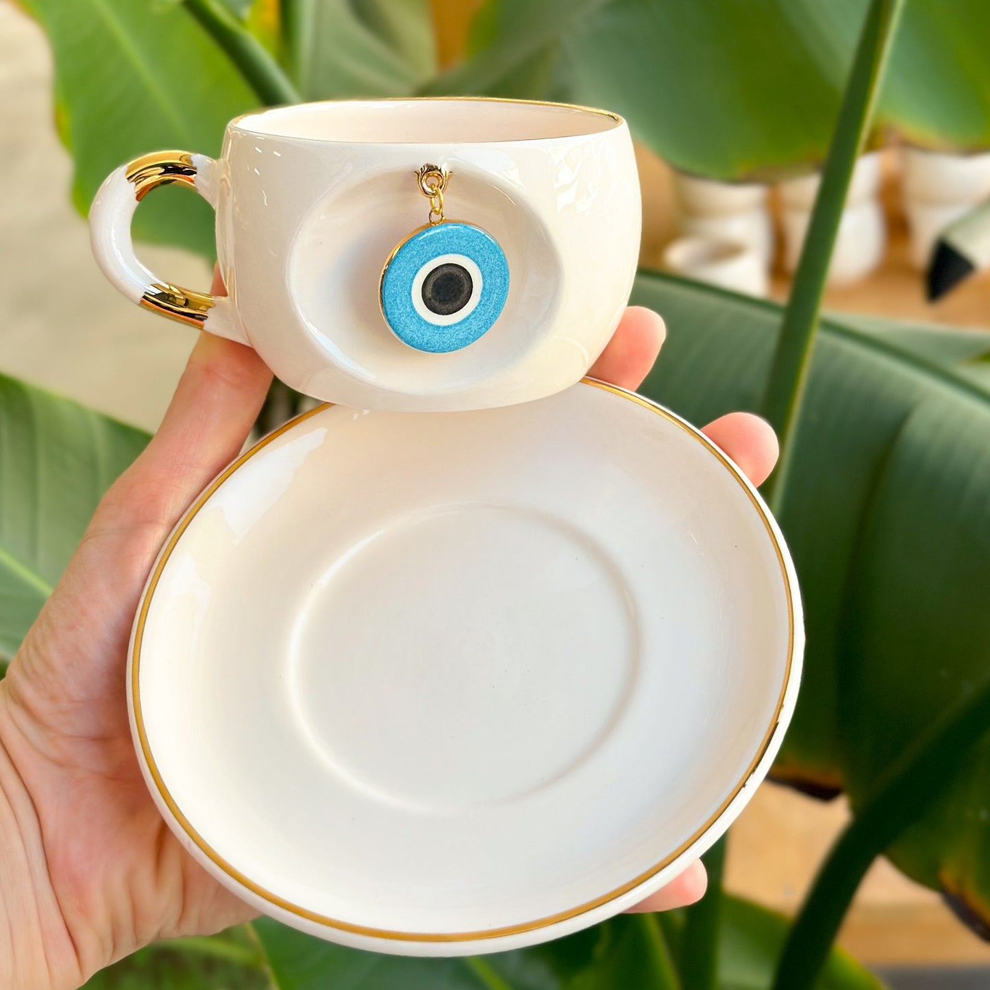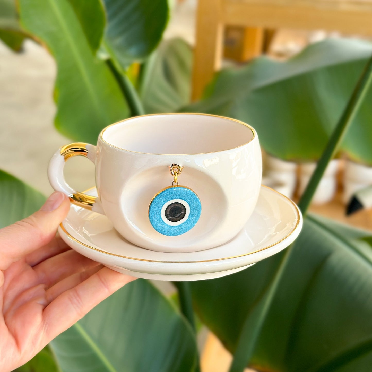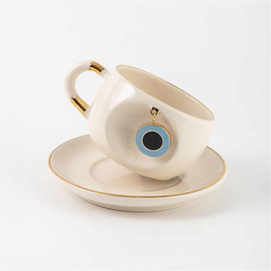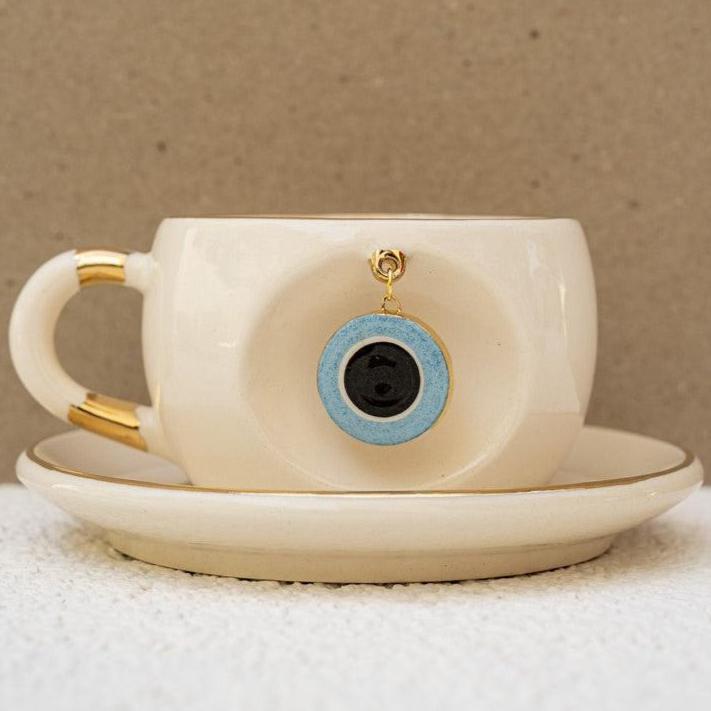 Ön yüzdeki oyukta, üretim sırasında gövdeyle birlikte oluşturulan sabit halkaya takılı seramik nazar figürü yer alır; bu sağlam yapı sayesinde çıkma söz konusu değildir. Kulp, ağız kenarı ve tabağın çevresindeki 24 ayar altın çizgiler fincana sofistike bir ışıltı katar. Anlamlı ve şık bir nazar boncuklu fincan arayanlar için hem günlük ritüellerde hem de hediye seçimlerinde fark yaratan bir alternatiftir.
