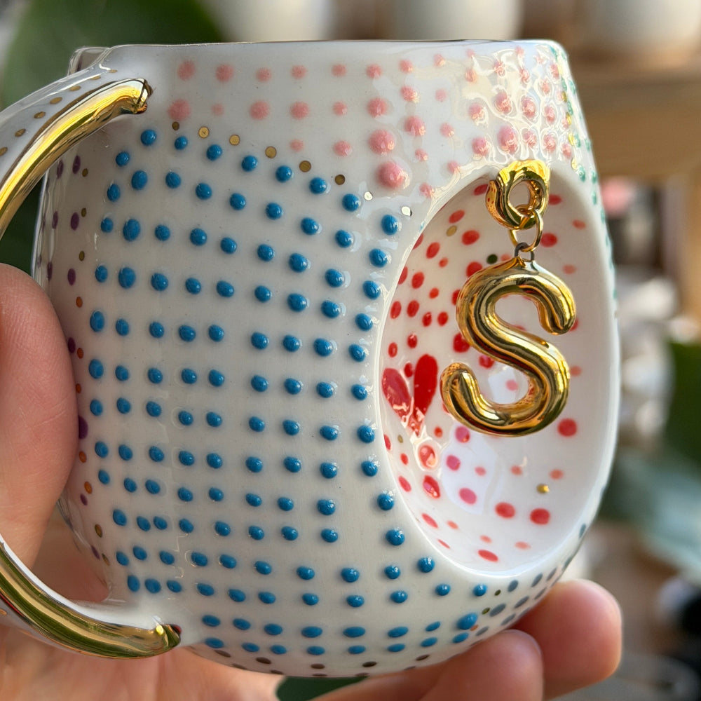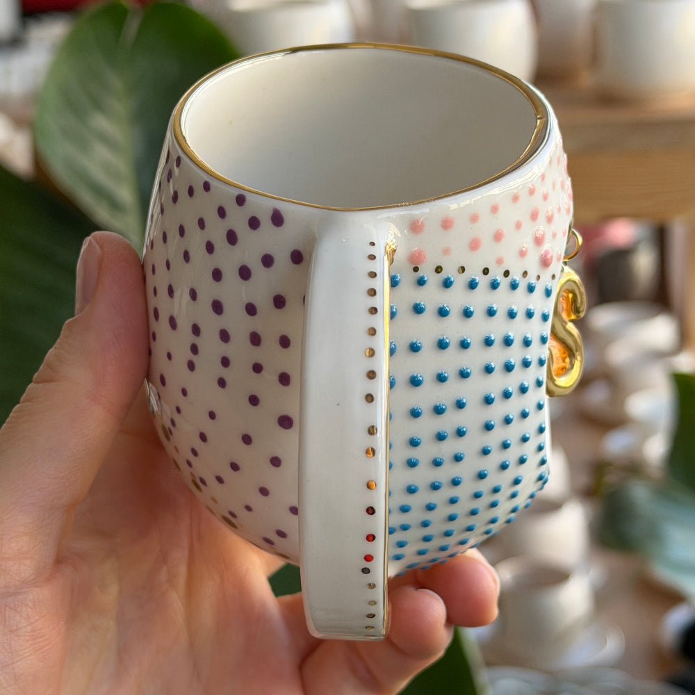 Tamamen el işçiliğiyle üretilen bu özel parça, yüksek kalite porselen çamurundan şekillendirilmiş ve su bazlı, alerjen içermeyen boyalarla elde boyanmıştır. Yüzeyindeki renkli nokta dokuları ve gerçek altın kaplama harf detayıyla dikkat çeker. Her biri özenle hazırlanan bu özel tasarım, günlük kullanıma uygun olduğu kadar dekoratif bir parça olarak da öne çıkar.