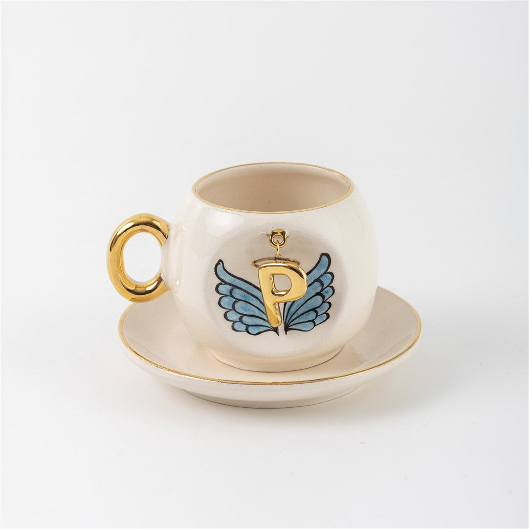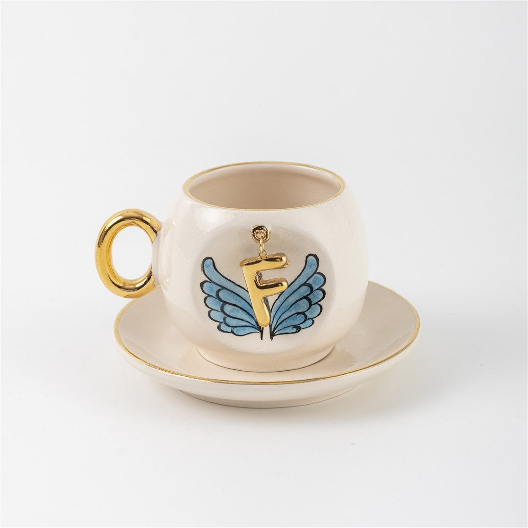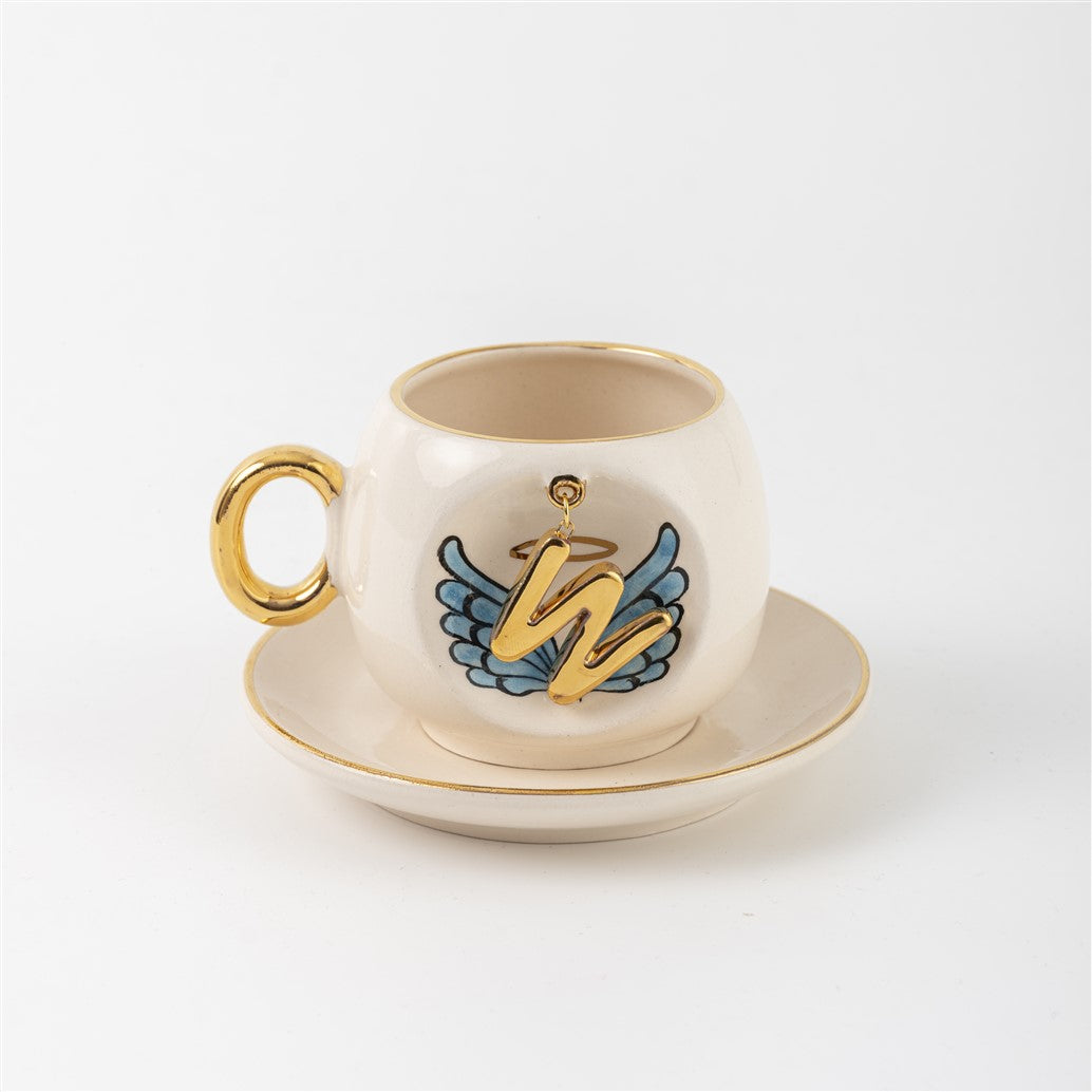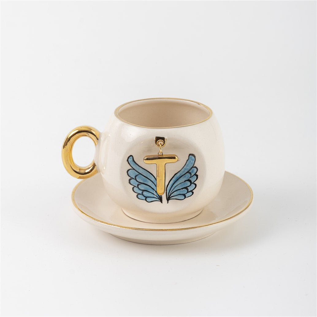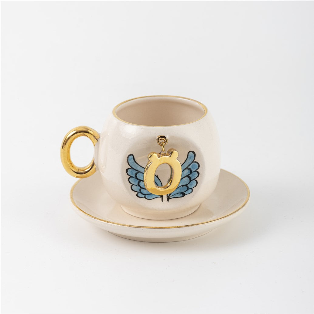 Harfli Mavi Melek Kanatlı Kahve Fincanı