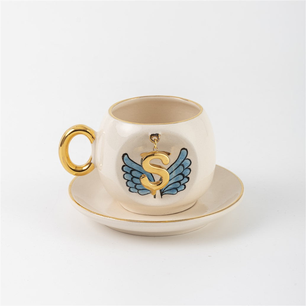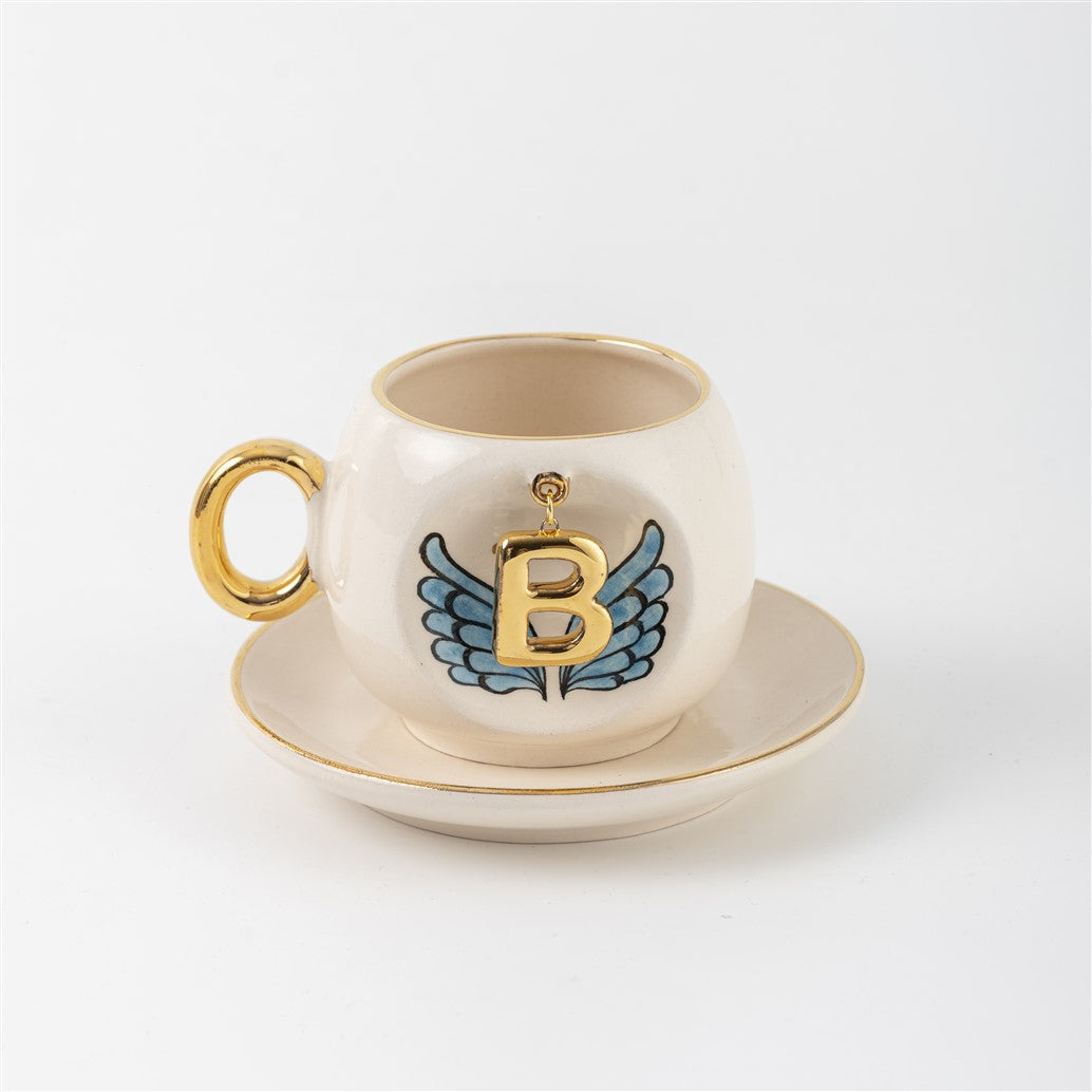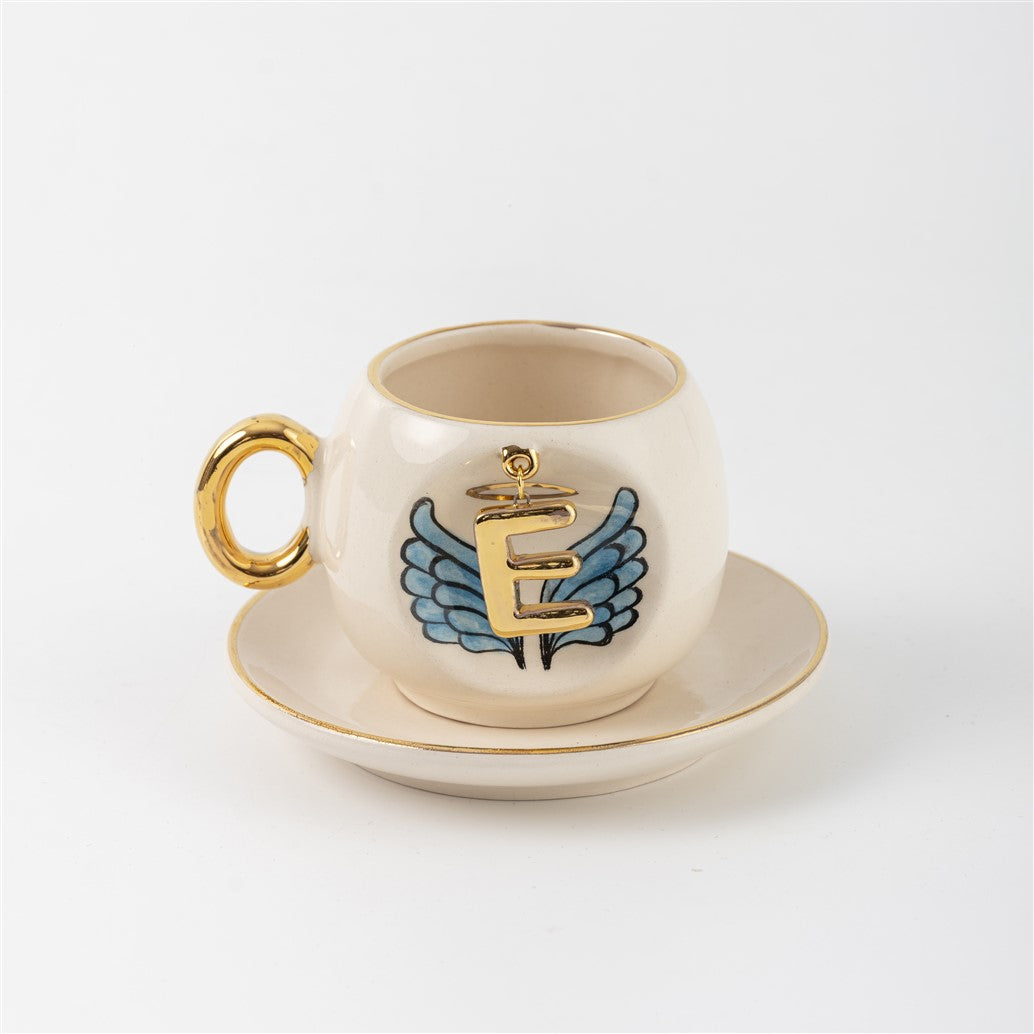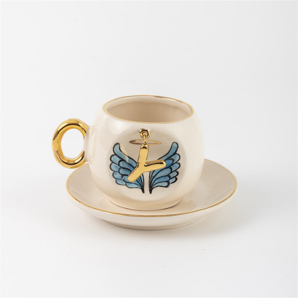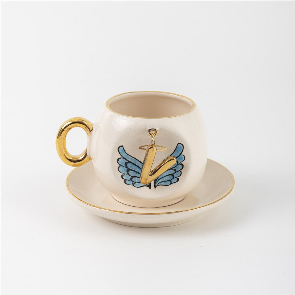 Harfli Mavi Melek Kanatlı Kahve Fincanı