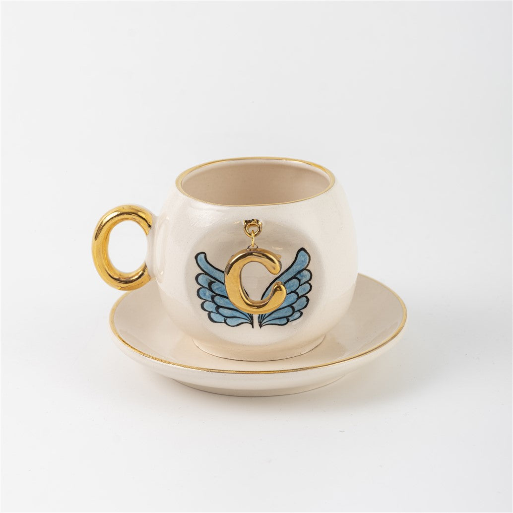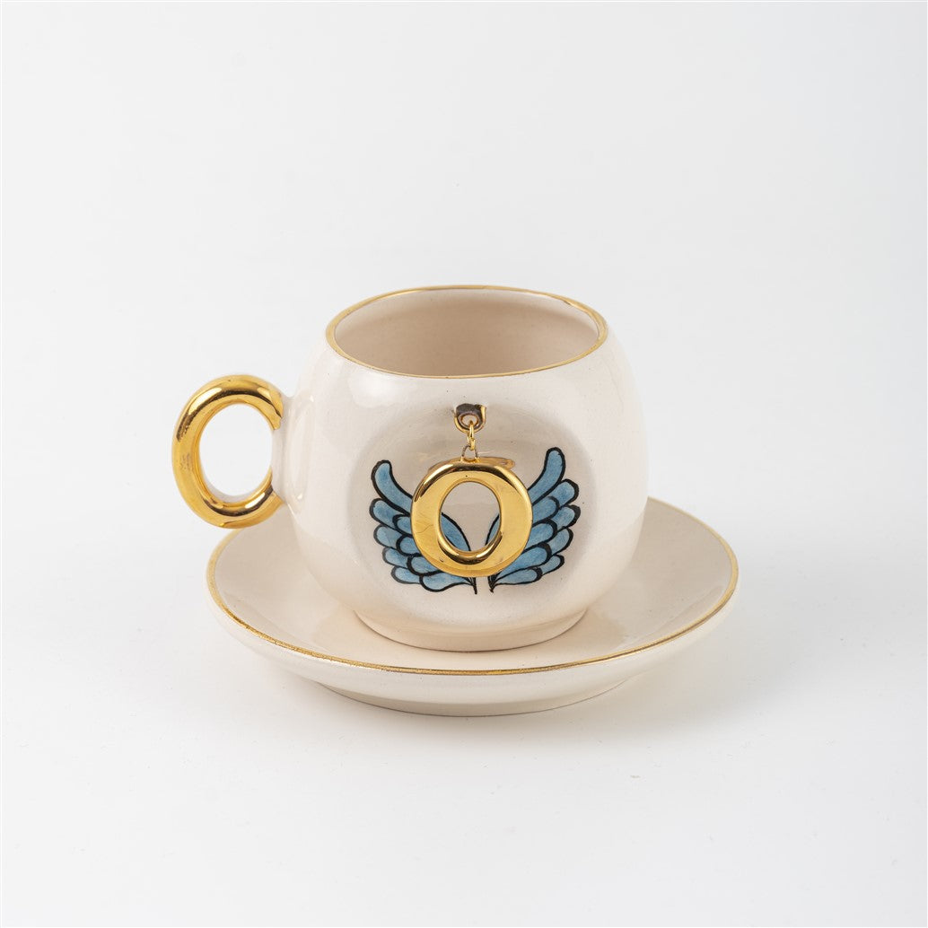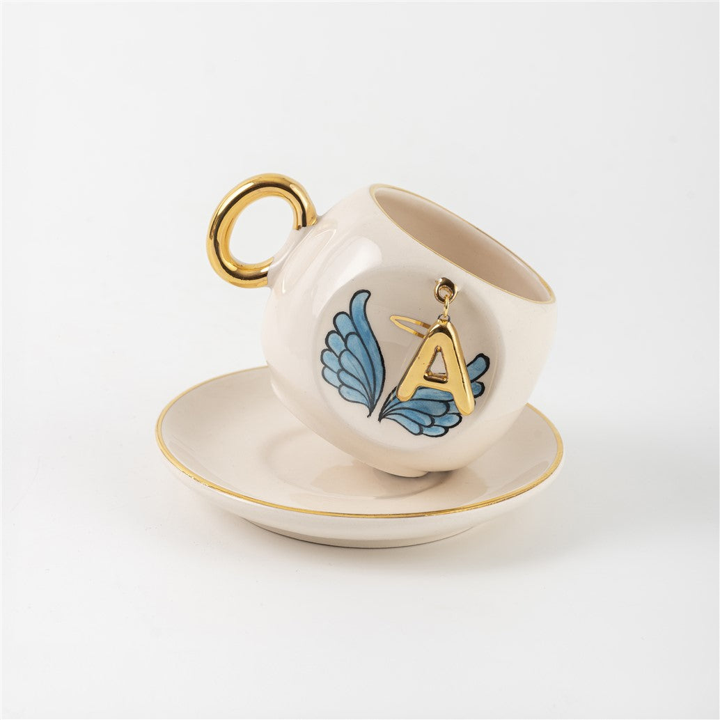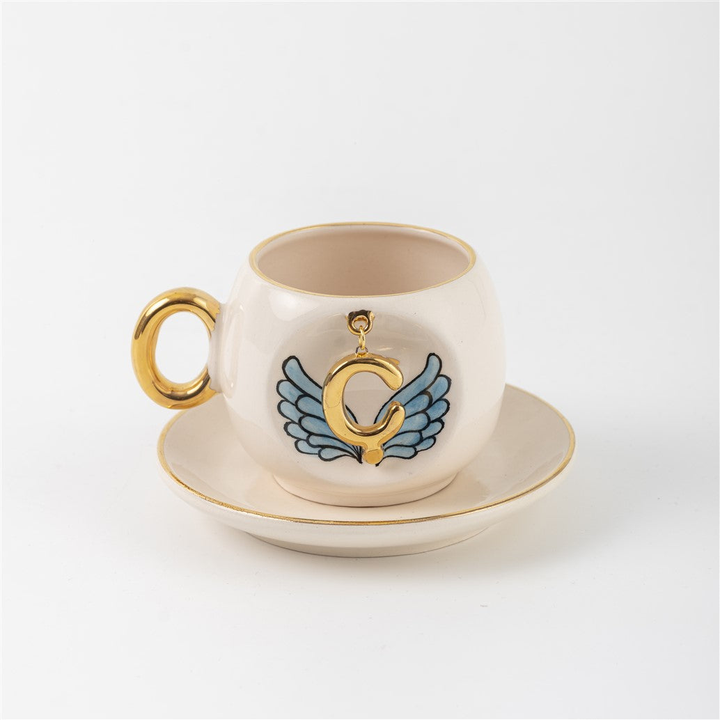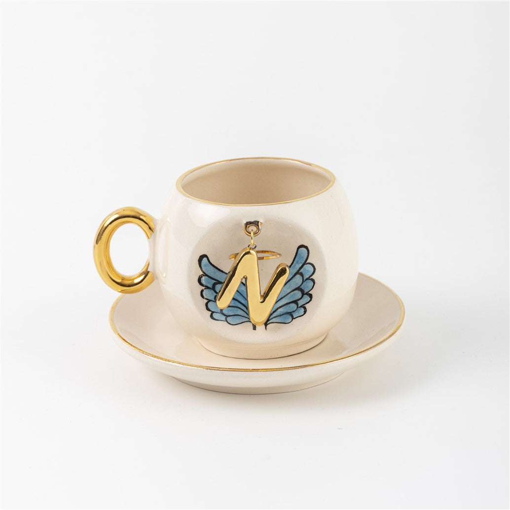 Harfli Mavi Melek Kanatlı Kahve Fincanı