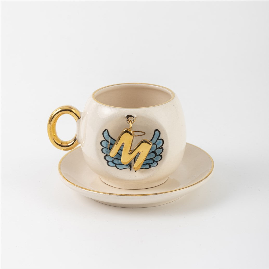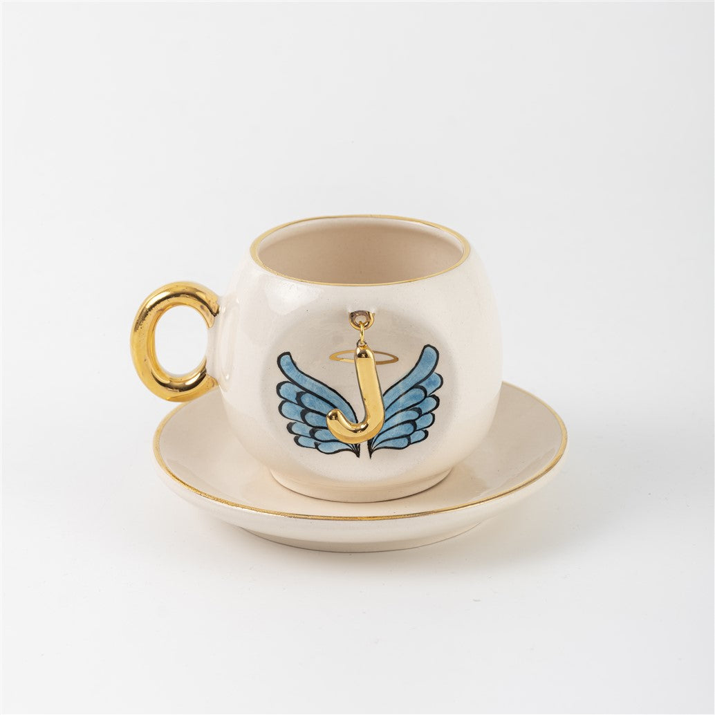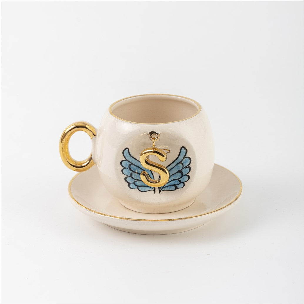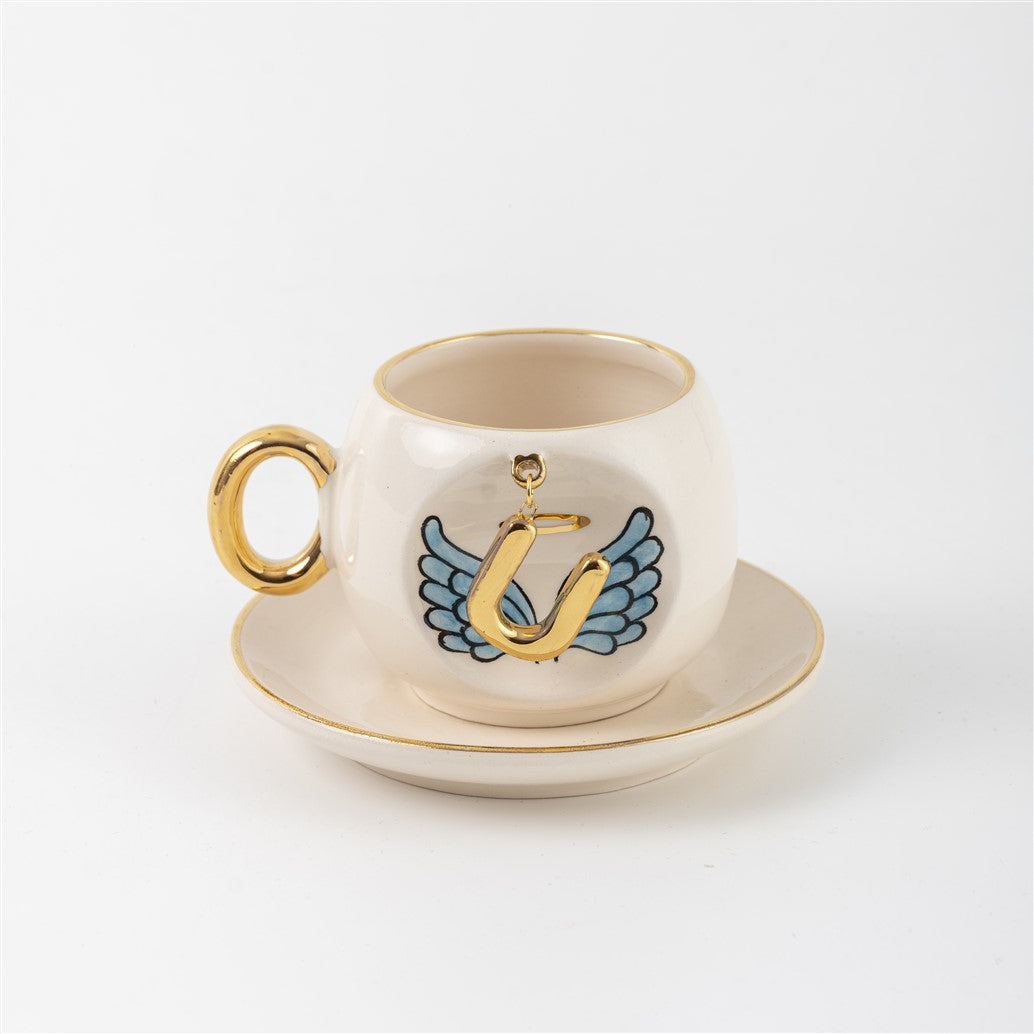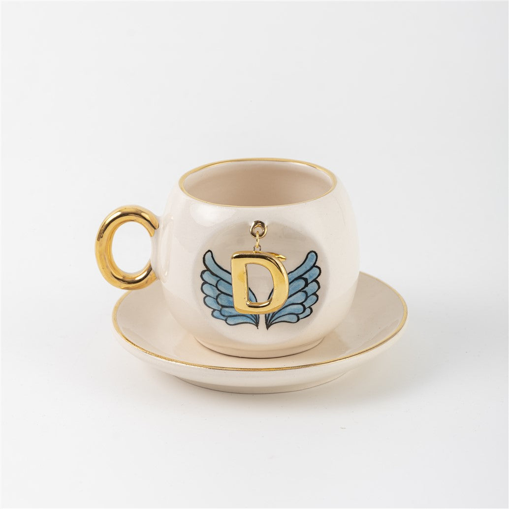 Harfli Mavi Melek Kanatlı Kahve Fincanı