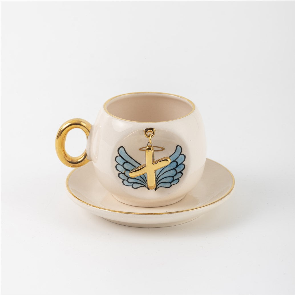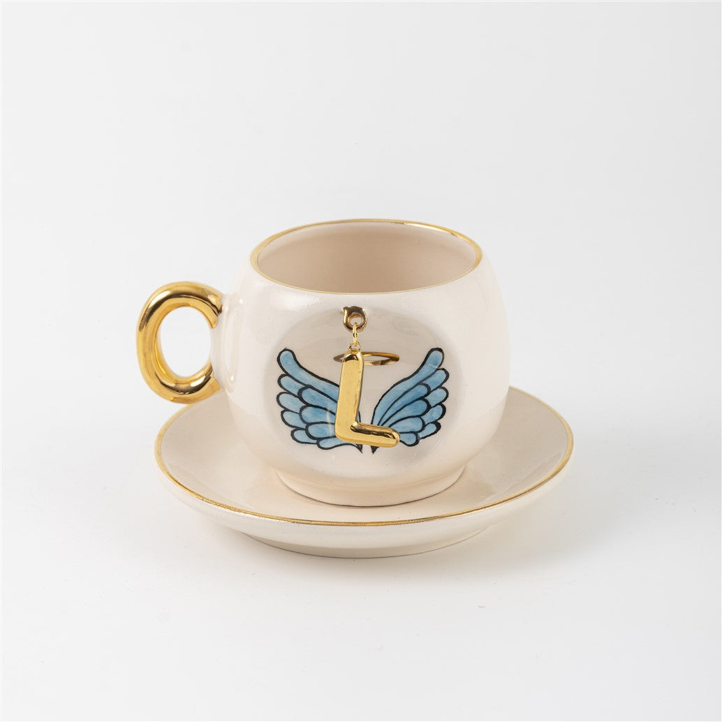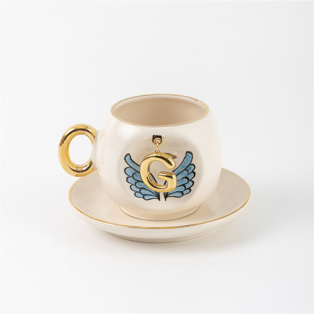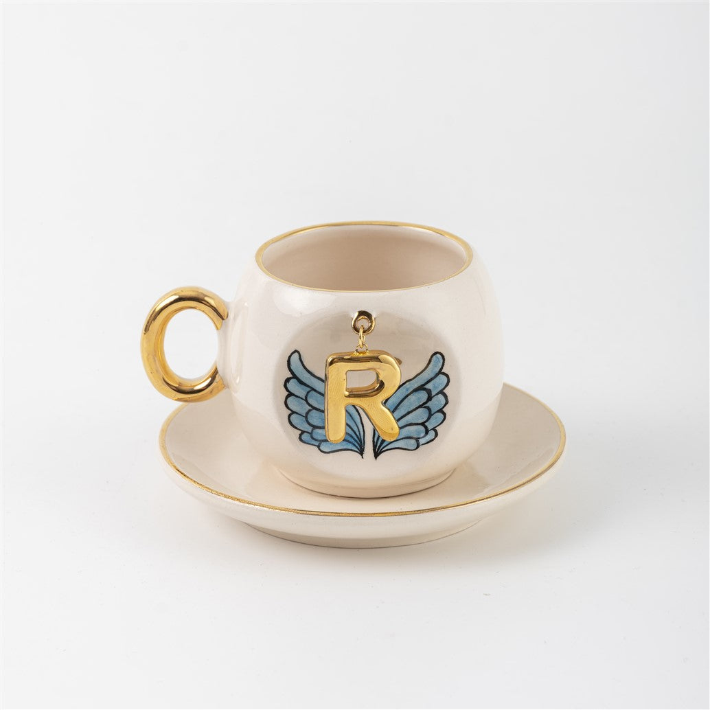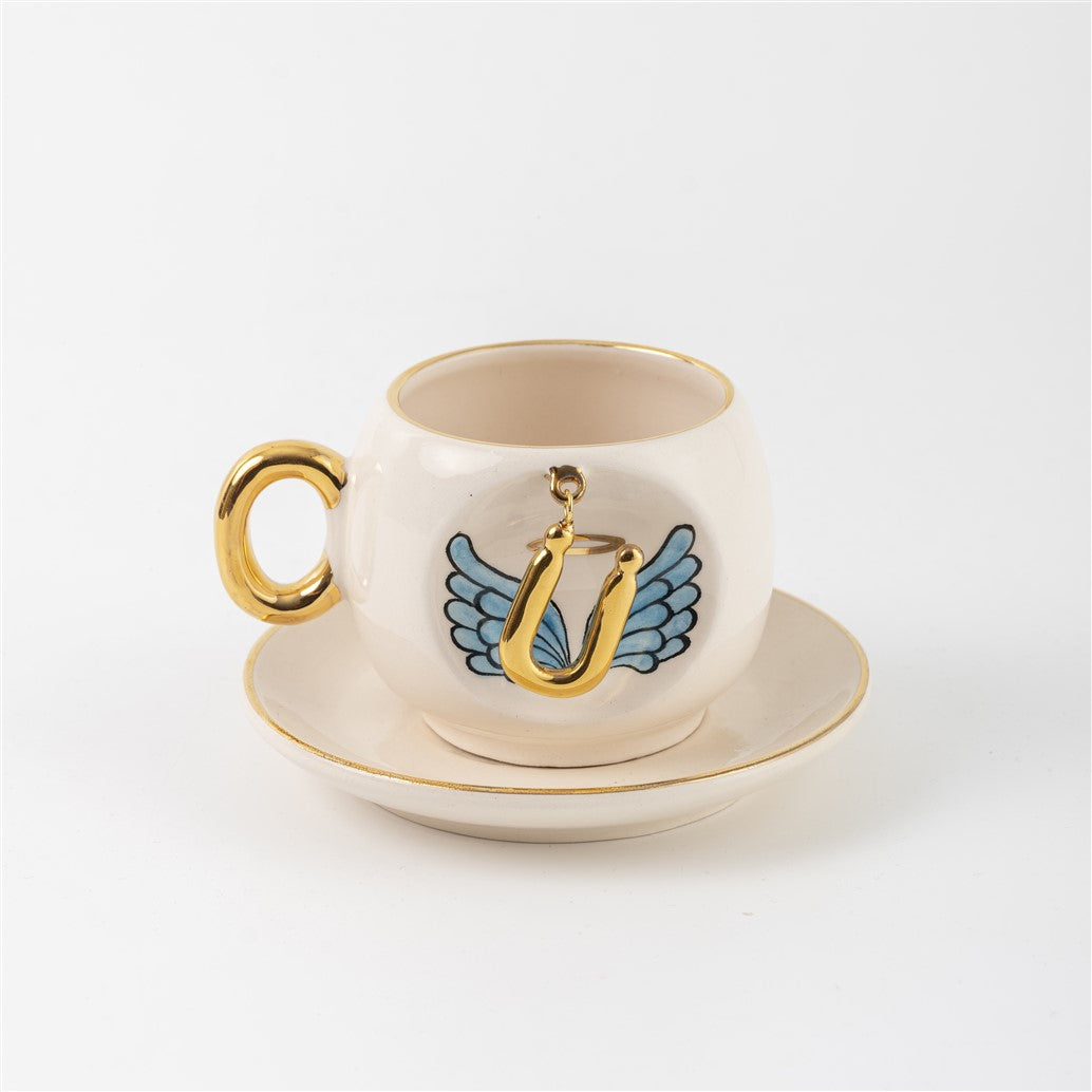 Harfli Mavi Melek Kanatlı Kahve Fincanı