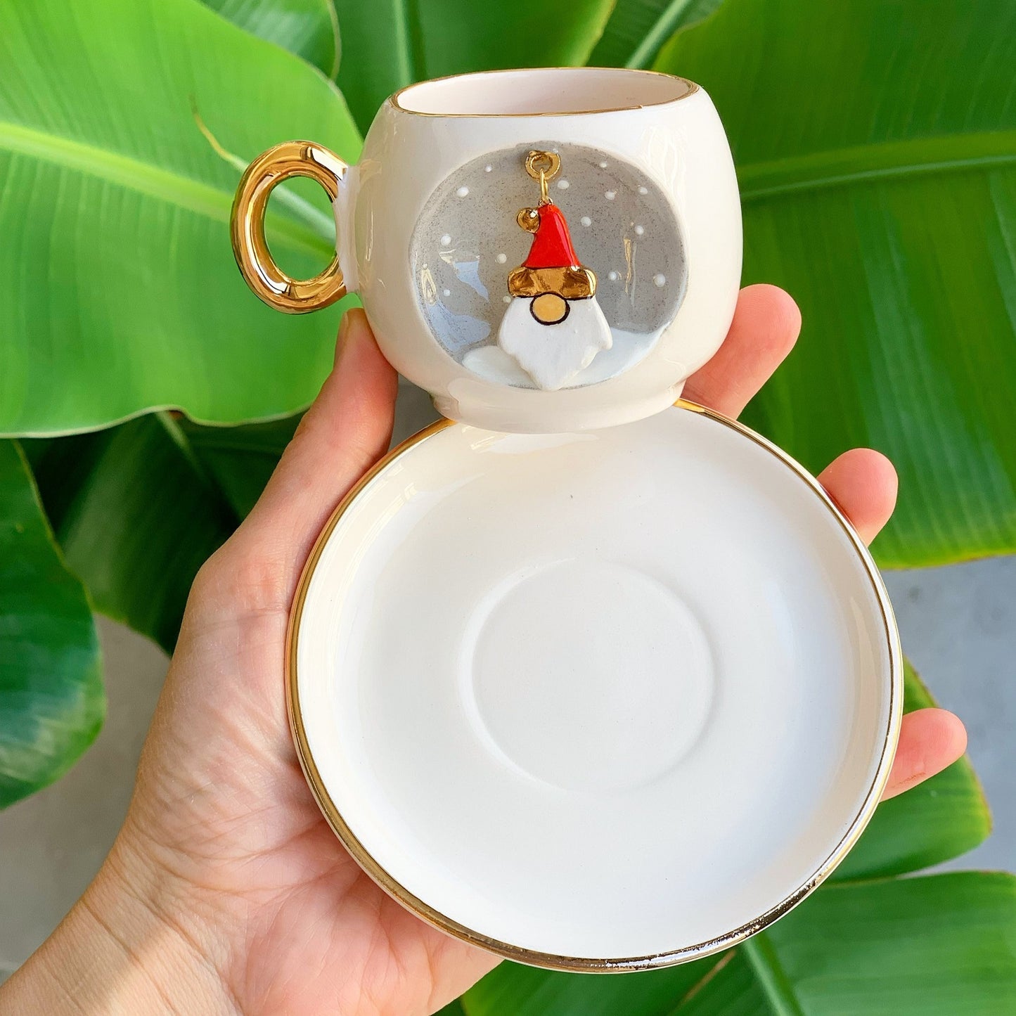 Noel Baba Kahve Fincanının 24 ayar gerçek altın kaplama halkası, ağız kısmı ve tabağının kenarları, tasarımı daha da zarif hale getirir. Yeni yıl kahve fincanı olarak, yılbaşı sofralarına renk katarken, kahve veya çay keyfini unutulmaz kılar.