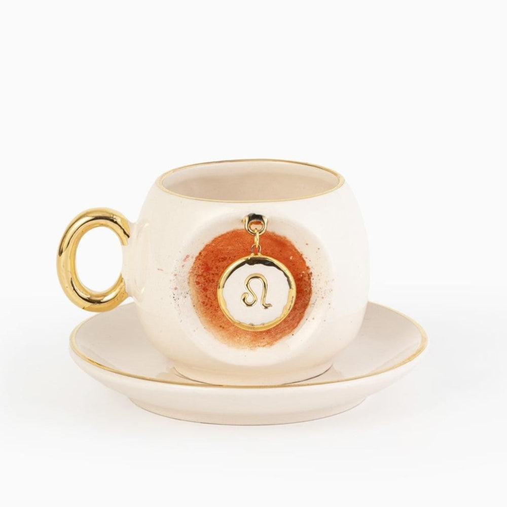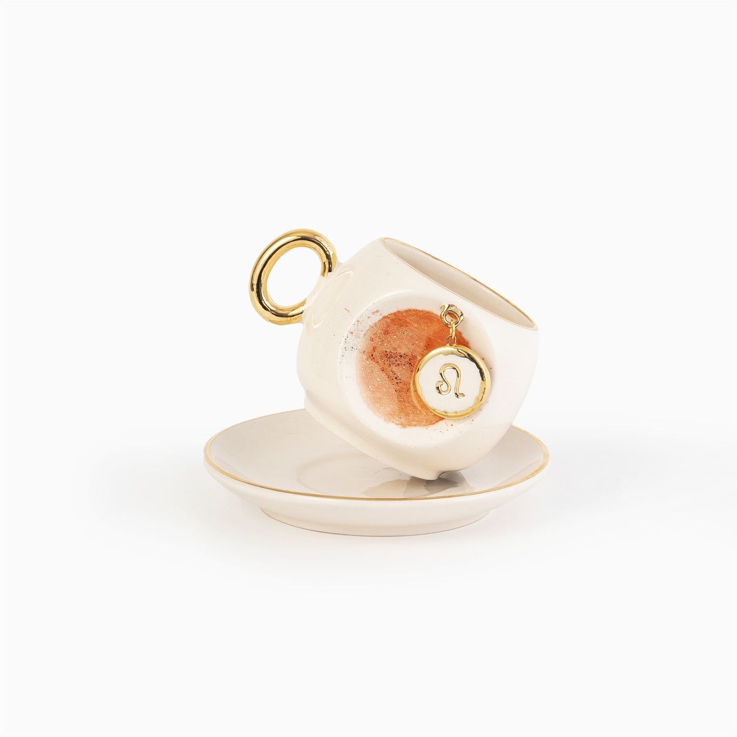 Bu ürün fincan üzerindeki oyukta sabit halkaya takılı seramik zodyak aslan burcu figürü içerir. Halka, üretim aşamasında fincanla beraber üretildiği için çıkma söz konusu değildir.