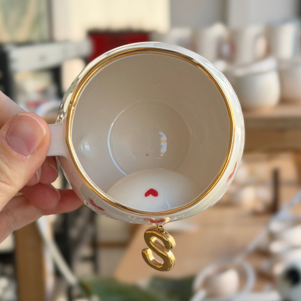 El işçiliğiyle üretilen bu özel kupa, beyaz porselen zemin üzerine uygulanan el boyaması figürleri ve kalp detaylarıyla sıcak ve samimi bir görünüm sunar. Ön yüzde yer alan 24K gerçek altın kaplama harf, sabit halkaya bağlı şekilde üretim aşamasında kupayla birlikte oluşturulur; sonradan ekleme değildir ve kullanım sırasında çıkma yapmaz. İnce el çizimi figür, tasarıma hikâyesi olan duygusal bir karakter kazandırır.