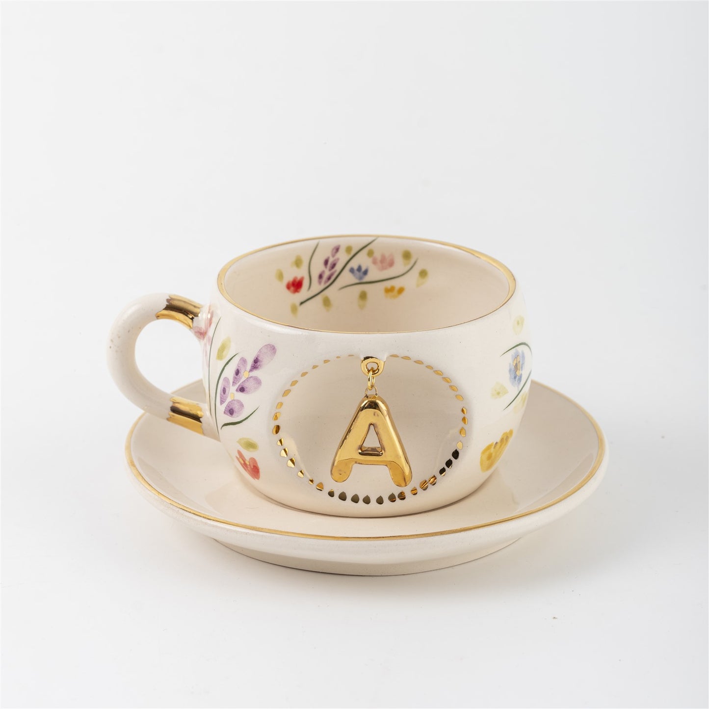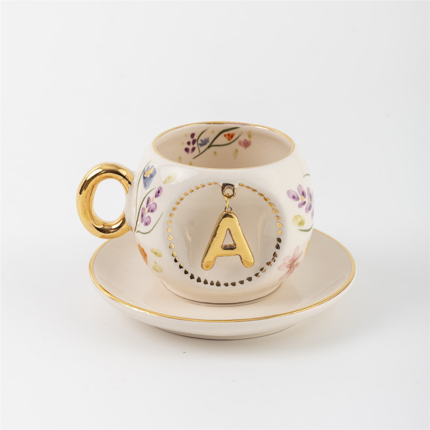 Ön kısmında yer alan sallanan harf detayı, 24 ayar gerçek altınla kaplanmış seramik bir yüzey üzerine yerleştirilmiştir ve tamamen kişiye özeldir. Ayrıca, fincanın kulpu, ağız kenarı ve tabak çevresi de altınla detaylandırılarak ürünün lüks dokusu tamamlanmıştır. Dilerseniz tabağa isim yazdırarak hediyenizi daha da özel hâle getirebilirsiniz.