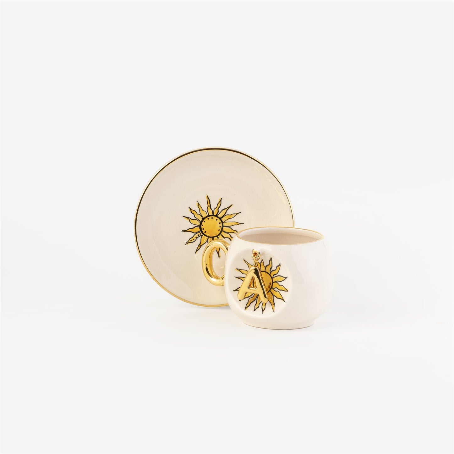 Bu ürün fincan üzerindeki oyukta ve tabakta Güneş Deseni ve sabit halkaya takılı seramik üzeri Altın Kaplama Harf içerir. Halka, üretim aşamasında fincanla beraber üretildiği için çıkma söz konusu değildir.