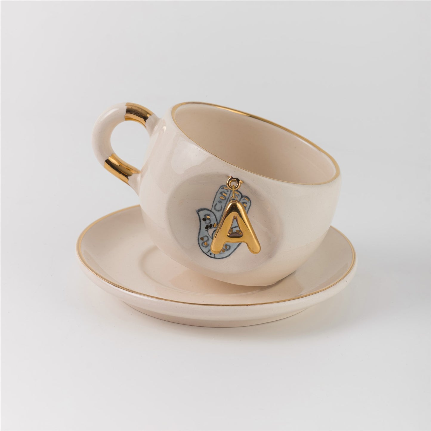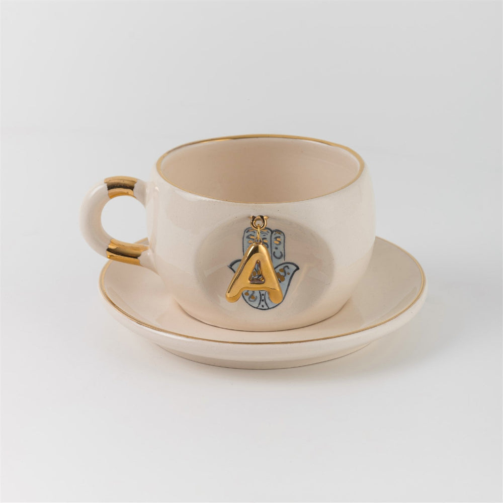 Bu ürün fincan üzerindeki oyukta Fatma ana Eli Deseni ve sabit halkaya takılı seramik üzeri Altın Kaplama Harf içerir. Halka, üretim aşamasında fincanla beraber üretildiği için çıkma söz konusu değildir.