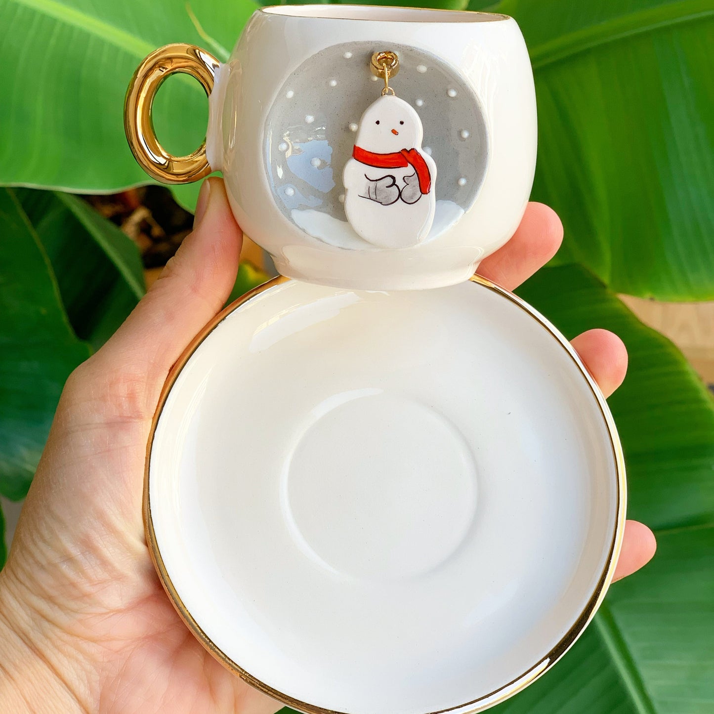 Fincan üzerindeki çizimlerin tamamı fırça çizimidir. Fincan üzerinde sabit halkaya takılı seramik kardan adam figürü içerir. Halka üretim aşamasında fincanla beraber üretildiği için çıkma söz konusu değildir.