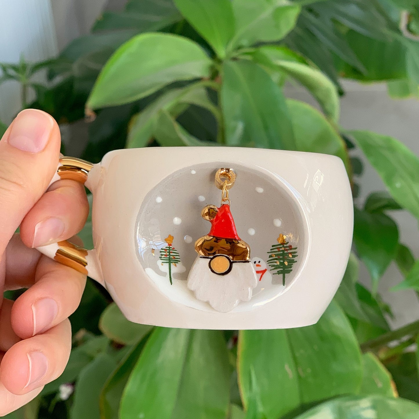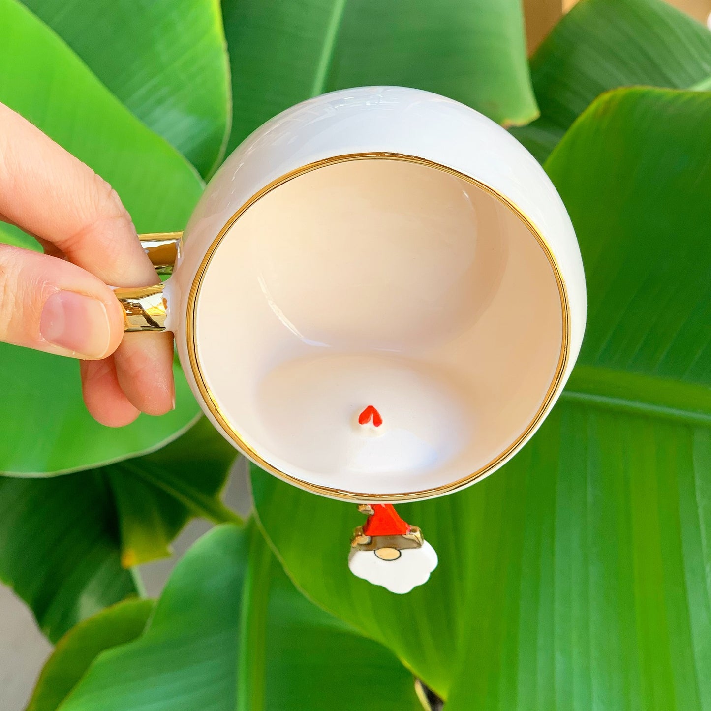 Fincan üzerindeki tüm çizimler fırça ile yapılmıştır ve her biri özenle işlenmiştir. Fincanın ön kısmında yer alan seramik Noel Baba figürü sabit halkaya takılı olarak yerleştirilmiştir ve üretim aşamasında fincanla birlikte üretilmiş olduğundan, çıkması söz konusu değildir. Bu detay, fincana özgün ve anlamlı bir dokunuş katmaktadır.